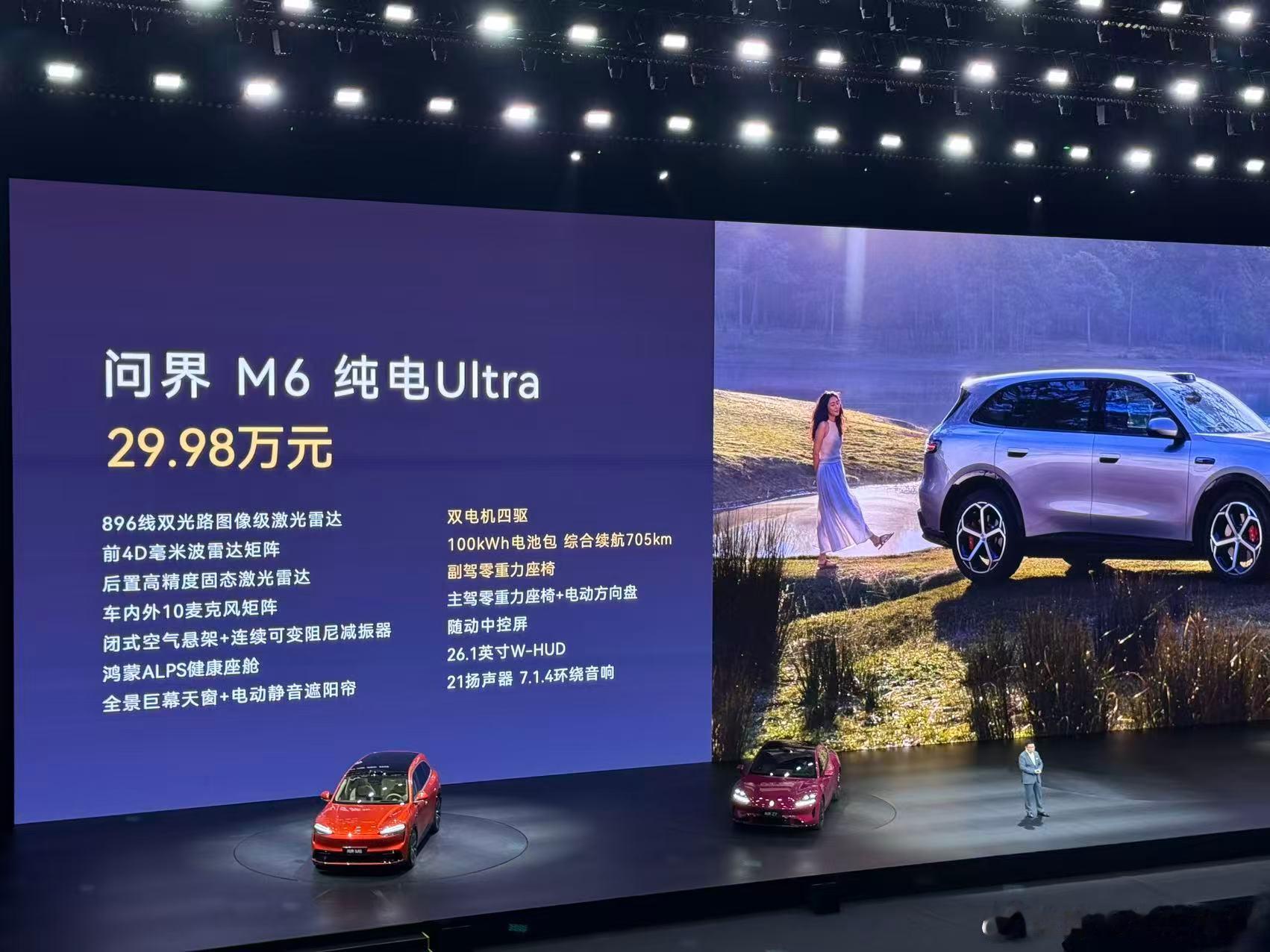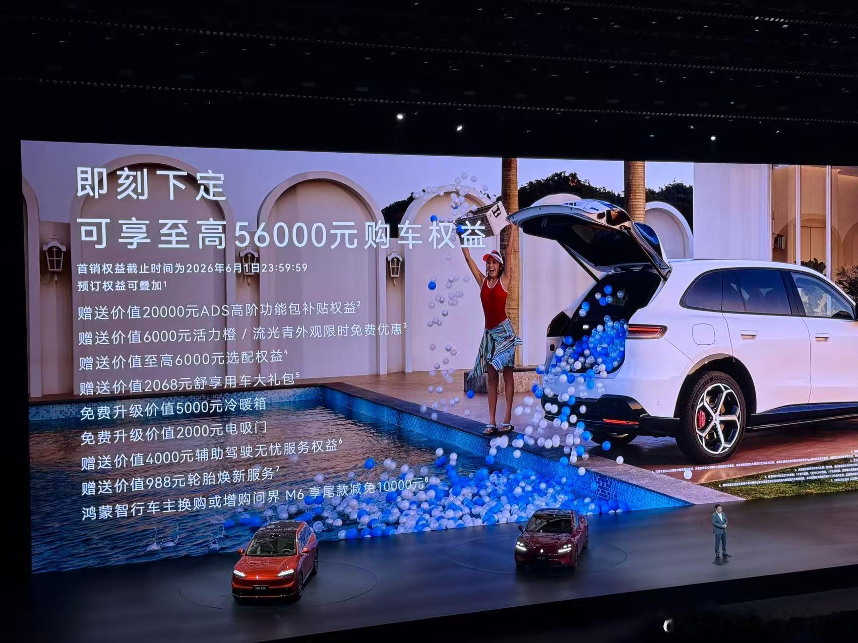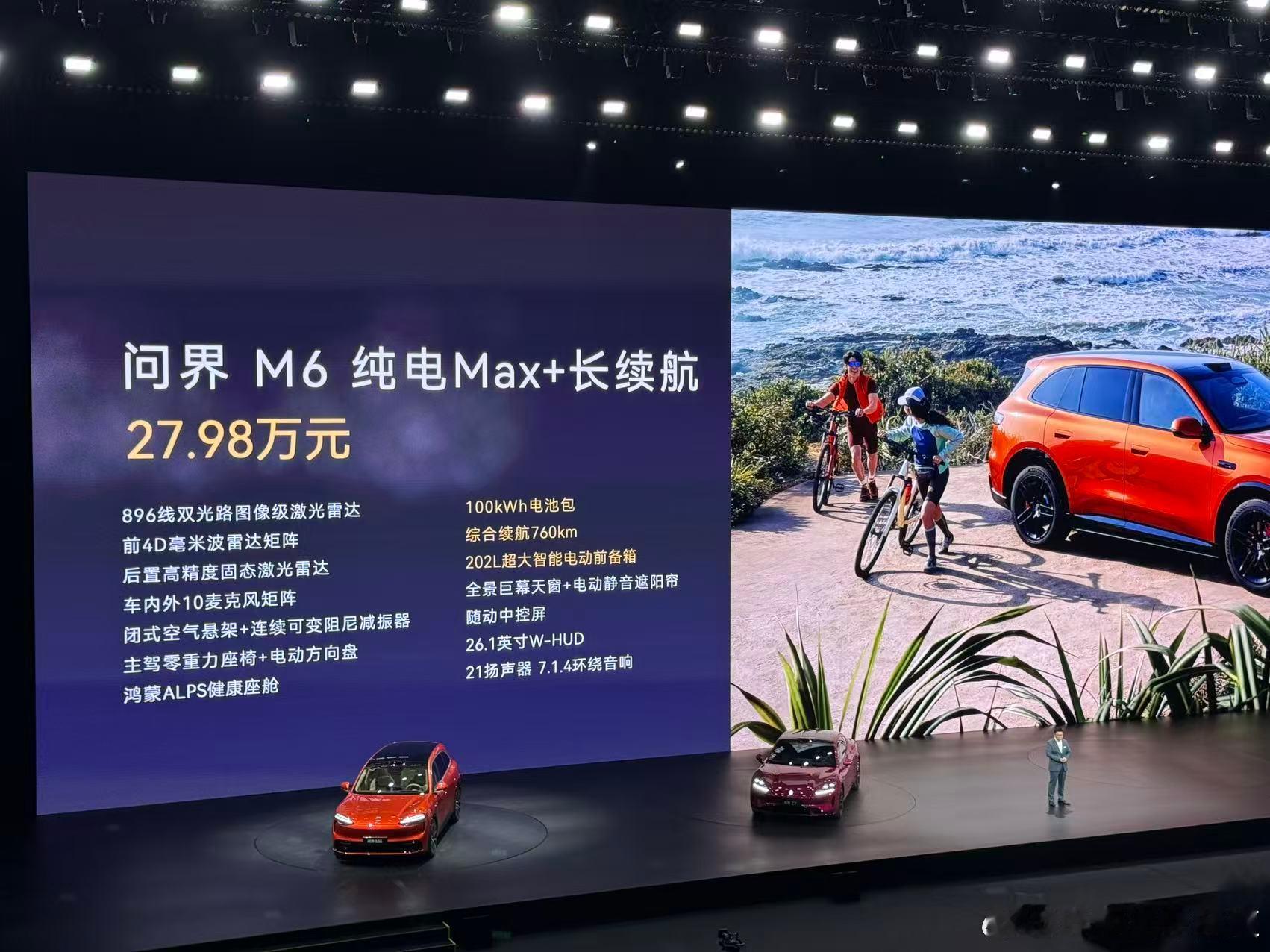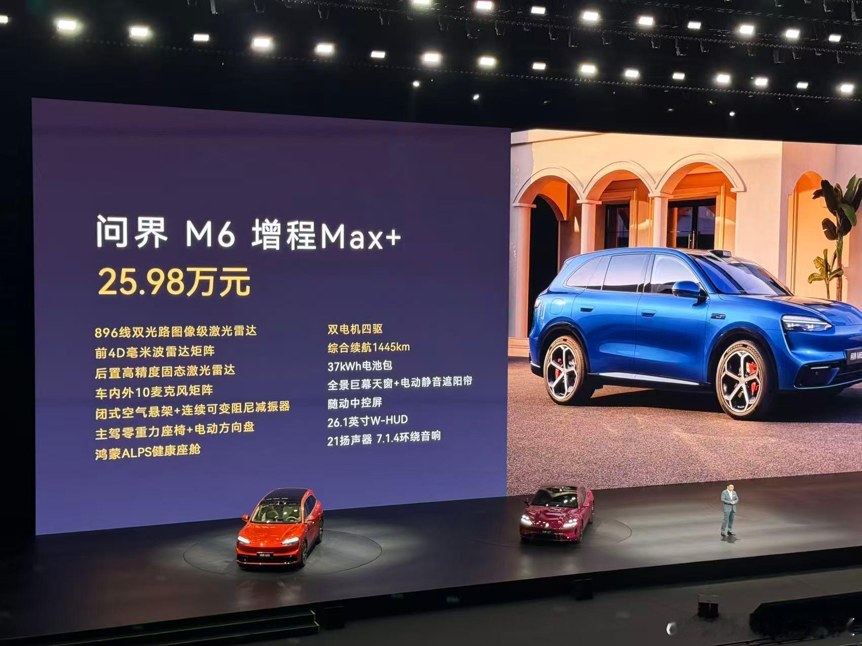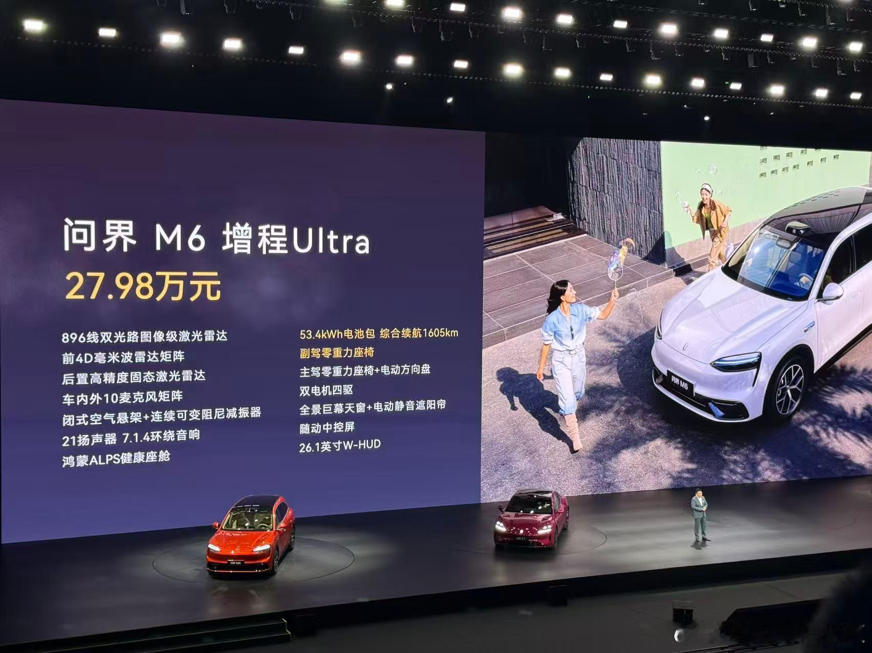 胖哥汽车频道 问界M6上市,共4款车型,售价区间为25.98万至29.98万元。问界M6车身尺寸为4960/1985/1736mm,轴距达2950mm,风阻系数低至0.239。外观延续家族设计语言,配备“晶曜大灯”与星河光效尾灯,提供7种车身配色。纯电版车型独有202L前备厢,支持语音、手势等8种开启方式;全车储物空间达35处,后备厢容积在860L(增程)至882L(纯电)之间。座舱方面,新车搭载鸿蒙座舱5.0,配备可左右旋转、前后伸缩的“向日葵屏幕”和26.1英寸W-HUD。副驾前方设有“灵感橱窗”,支持磁吸配件与氛围灯自定义。全系标配21扬声器HUAWEI SOUND音响、双无线充电面板,并提供10处磁吸接口用于扩展功能。座椅配置上,前排为一体式运动座椅,带加热/通风/按摩;后排靠背电动调节范围119°–132°,并配备小桌板、冷暖箱及17.3英寸吸顶屏。智能化是核心亮点之一:全系标配896线激光雷达及30个高精度传感器,搭载新一代华为ADS高阶智驾系统,支持高速/城区NOA及多种泊车场景。底盘方面,配备闭式单腔空气悬架与CDC电磁减振器,具备路面预瞄能力。安全层面,采用“十一横十一纵”车身架构,高强度钢占比83.62%,标配9安全气囊。动力上,增程版搭载1.5T发动机+双电机四驱,综合功率345kW,CLTC综合续航达1605km;纯电版提供后驱(227kW,760km续航)和四驱(340kW,705km续航)两种版本,均搭载97.64kWh电池,支持快充。鸿蒙智行发布会鸿蒙智行春季新品发布会
