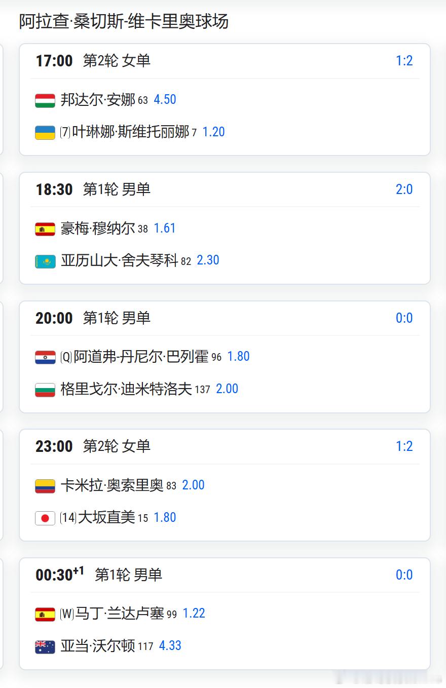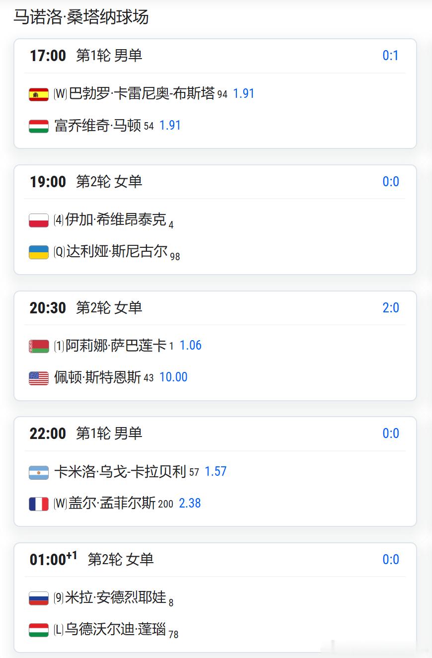 本西奇 vs 马幸科 北京时间:17:00 斯瓦泰克 vs 斯尼故尔 北京时间:19:00 萨巴莲卡 vs 斯特恩斯 北京时间:不早于20:30大坂直美 vs 奥索里奥 北京时间:23:00 安德列娃 vs 乌德沃尔迪 北京时间:不早于00:30