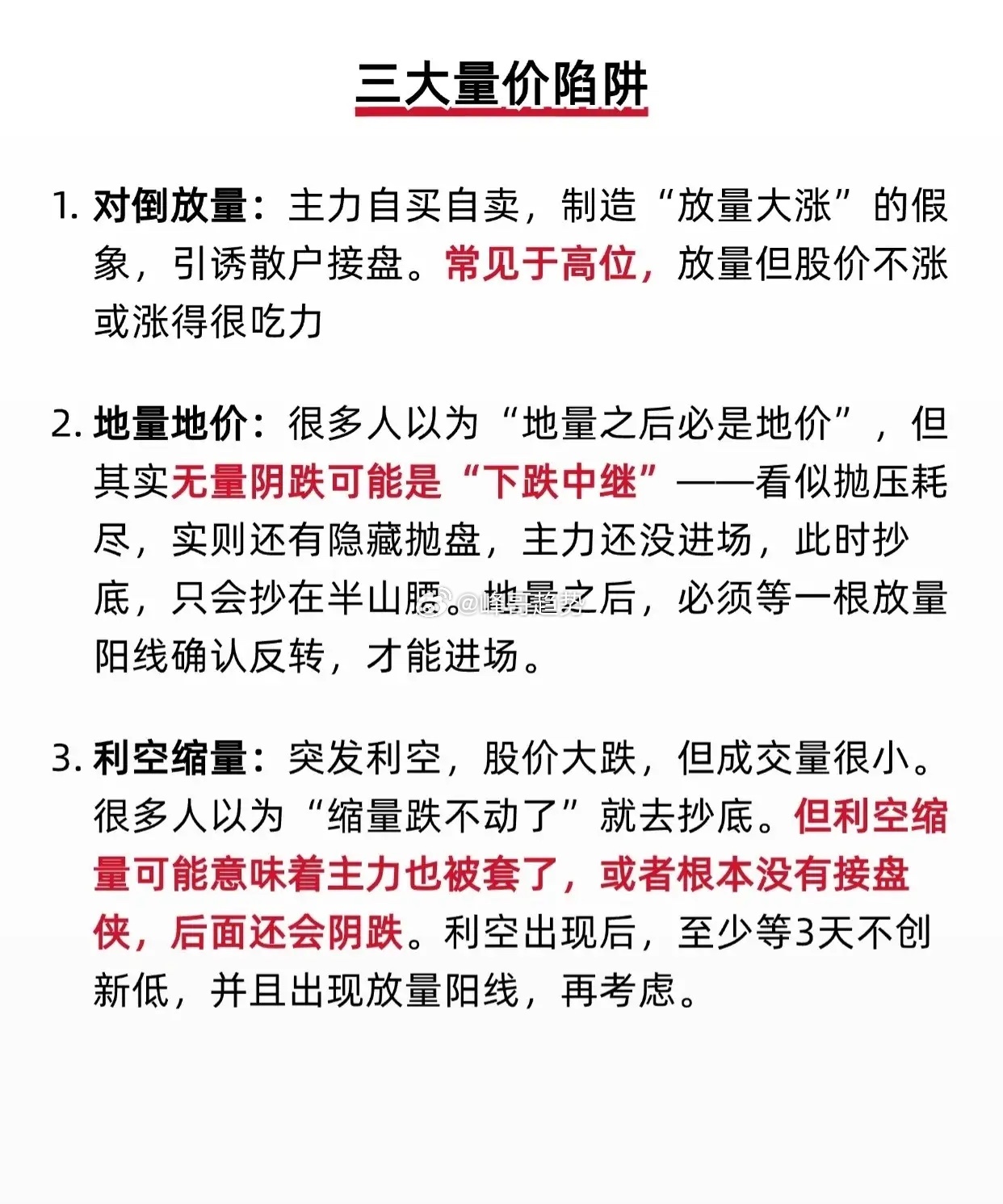 主力通过自买自卖的操作制造“放量大涨”的虚假繁荣,本质是诱导散户接盘。这类陷阱多发生于股价高位,表现为成交量放大但股价涨幅微弱(或几乎不涨),需警惕“放量滞涨”背后的出货风险。