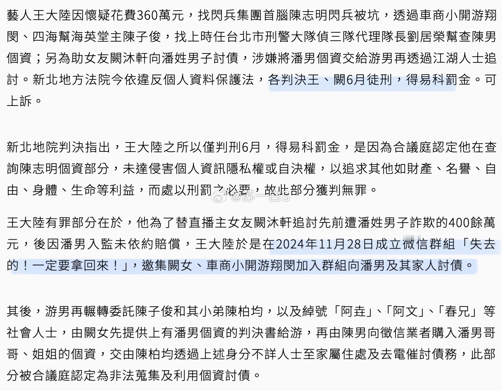 王大陆是因为他“闪兵”找人伪造病历,结果付了360万台币,对方失联了,事没办成,钱也没拿回来,他为了拿回钱,找关系找到台北市刑警部门的公职人员帮他违规查对方的个人资料;而他女友阙沐轩是因为早年被骗了400万台币,对方已经关进去了但没钱赔偿,她想要讨回这笔钱,所以就把对方的地址信息提供给了帮他们办事的人,想找到他的家属继而讨债,这也被法院认为违反了“《个资法》”……