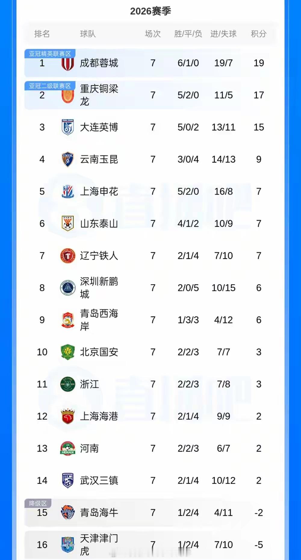 积分榜史诗级洗牌!统治榜首,传统豪门集体摆烂本轮战罢,2026赛季中超第7轮积分榜迎来彻底重构,的强势崛起,与传统豪门的集体低迷,形成了触目惊心的极致反差,中超的固有格局,已经被彻底改写。