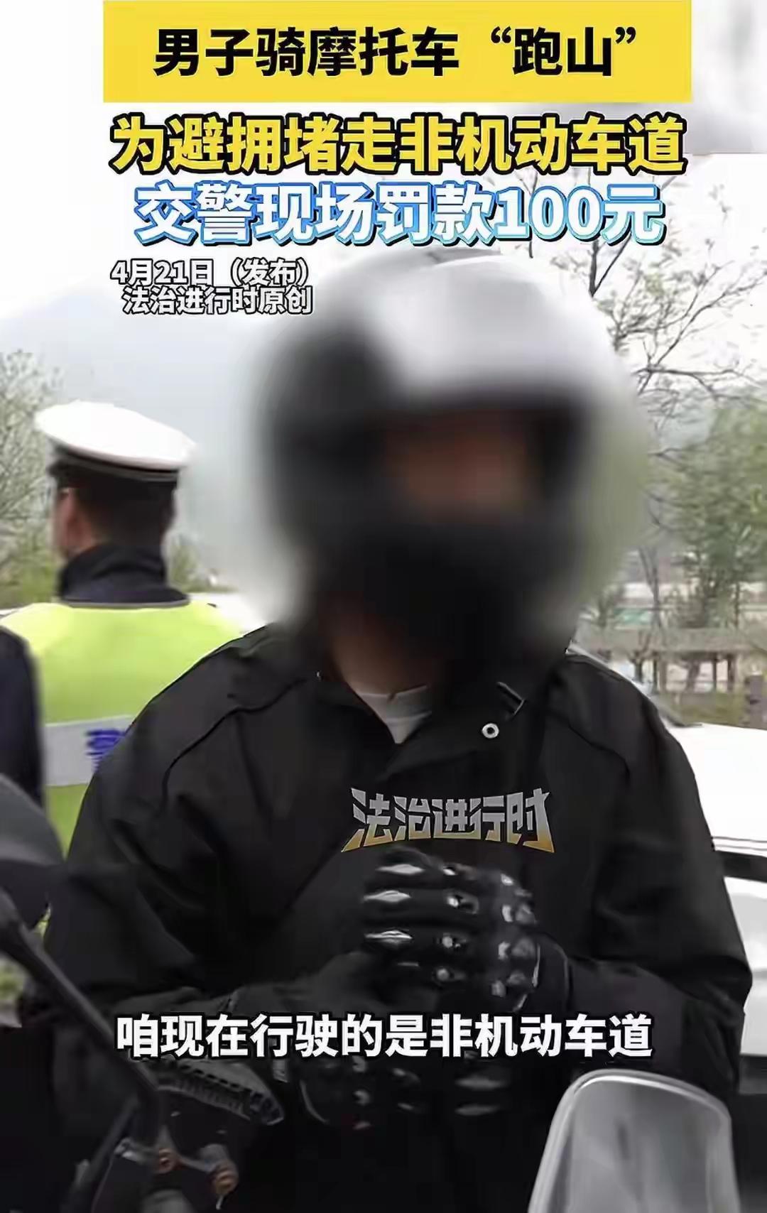 法规:摩托车属机动车,走非机动车道属违法(罚款100元)。山路借道极危险,且无“情有可原”。