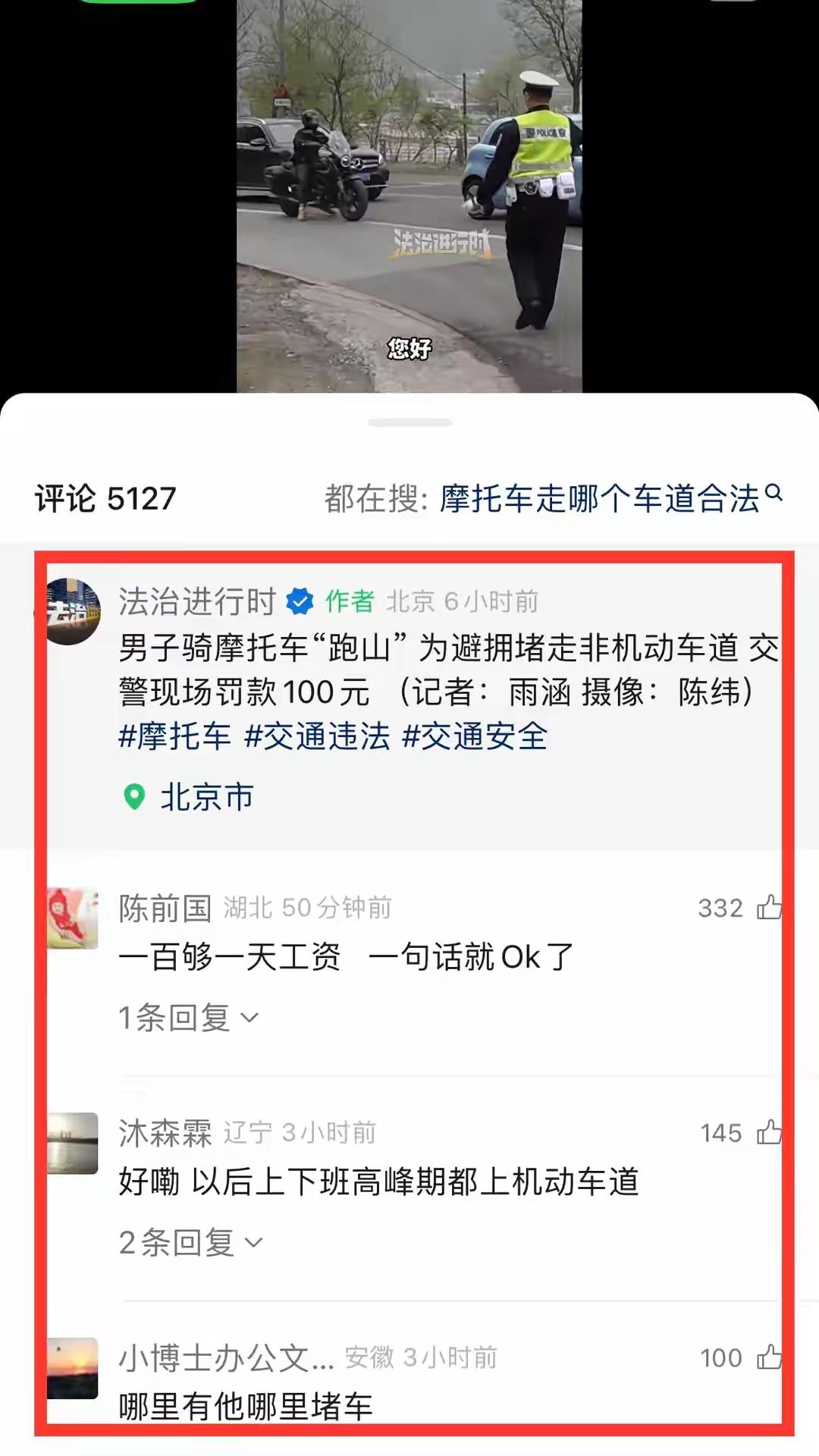事件:4月北京范崎路,摩友因堵车钻非机动车道被罚100元,现场两小时查车70余辆,风声正紧。
