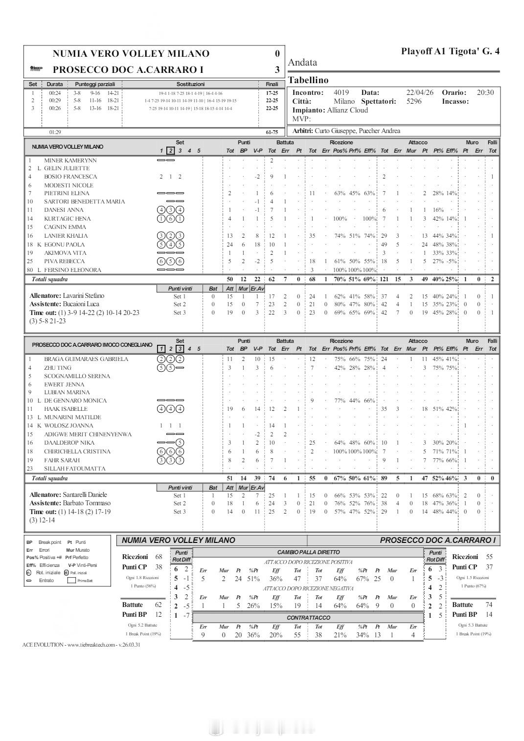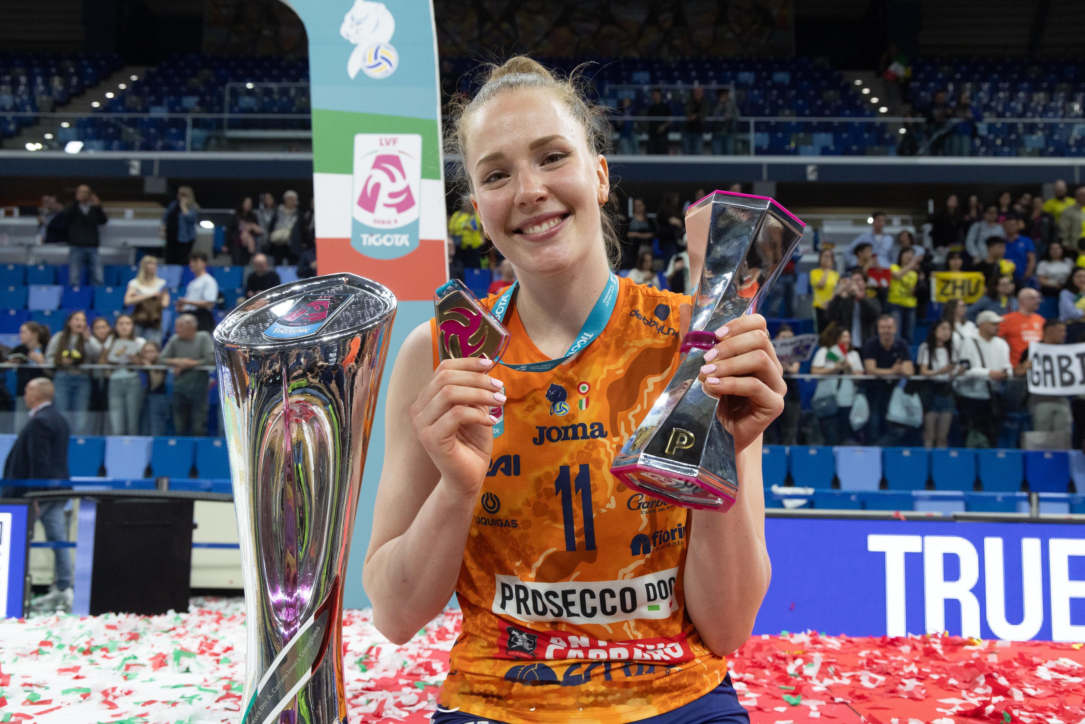 【意甲女排决赛科内总分3-1米兰实现八连冠 哈克MVP】国际排坛战报速递中国排球留洋动态 4月22日米兰,意甲女排决赛第四回合,科内利亚诺客场3-0(25-17/25-22/25-22)完胜米兰,以总比分3-1获胜,成就八连冠伟业,也是总共第九个联赛冠军。MVP哈克19分、加比11分、朱婷3分(4扣3中),埃格努24分、拉涅尔13分。