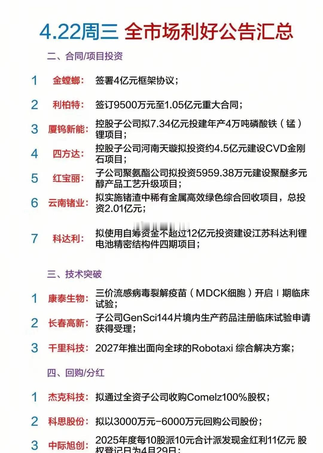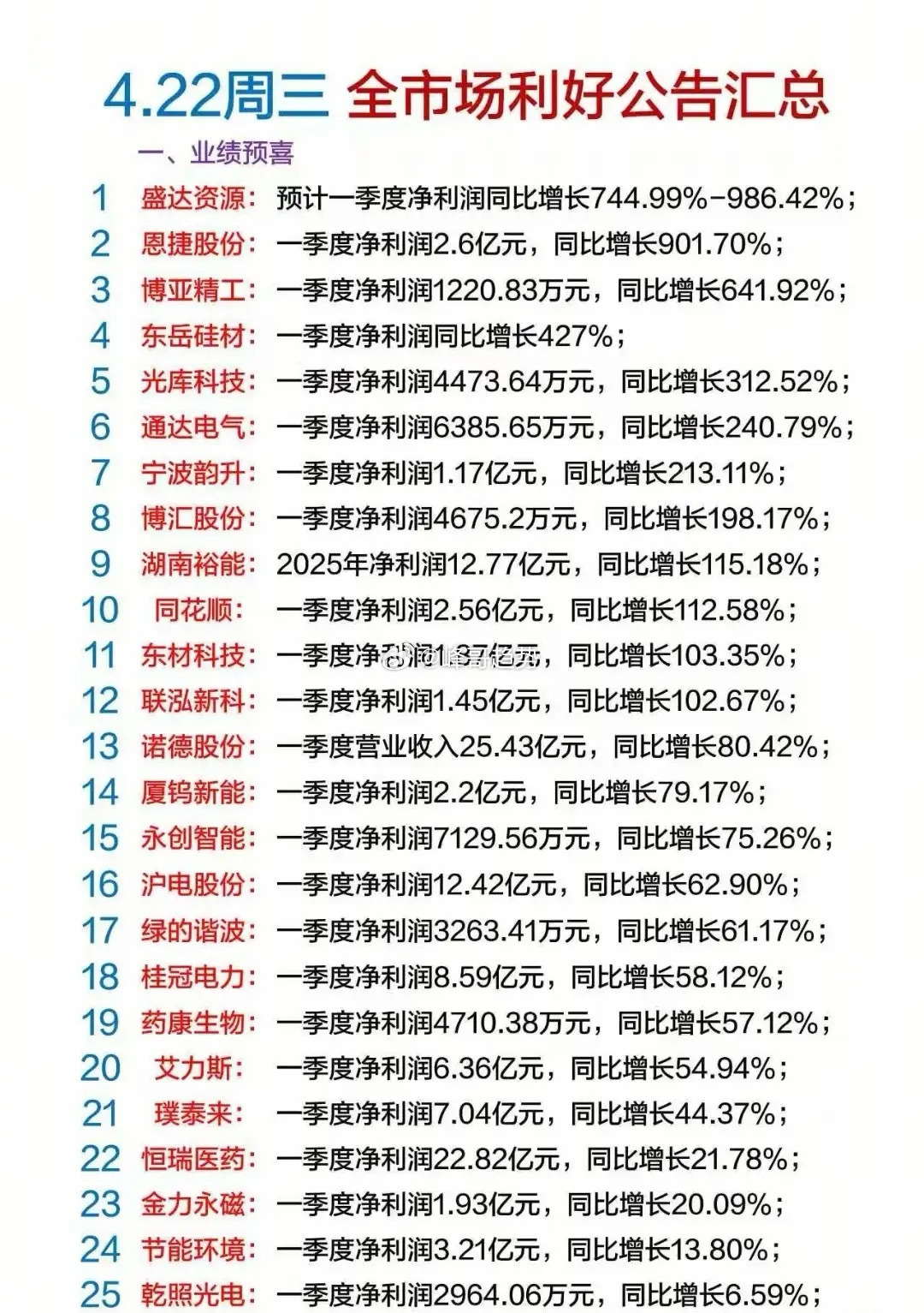 4月22日晚间利好来袭!从业绩爆发到项目落地,从技术突破到分红回购,多维度的积极信号正在为市场注入信心。- 业绩端:盛达资源、恩捷股份等多家公司一季度净利润同比暴涨,沪电股份、同花顺等核心赛道标的也交出了亮眼答卷,展现出强劲的盈利韧性。