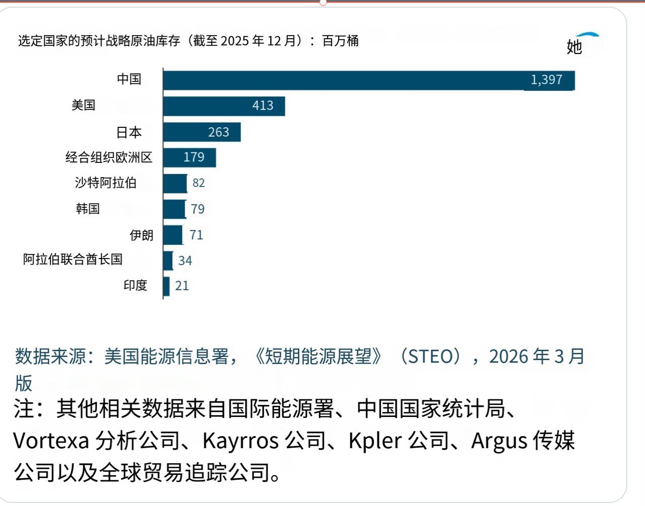 美国、日本和经合组织欧洲国家的储备加起来:8.55亿桶值得注意的是,美国的数据(4.13亿桶)主要指战略石油储备,其商业库存是另外计算的(通常规模也很大)。而我国的统计口径往往包含国家战略储备和部分大型国企的商业储备。尽管如此,我国近年来大规模扩建储备基地(如利用地下盐穴储油)是不争的事实。