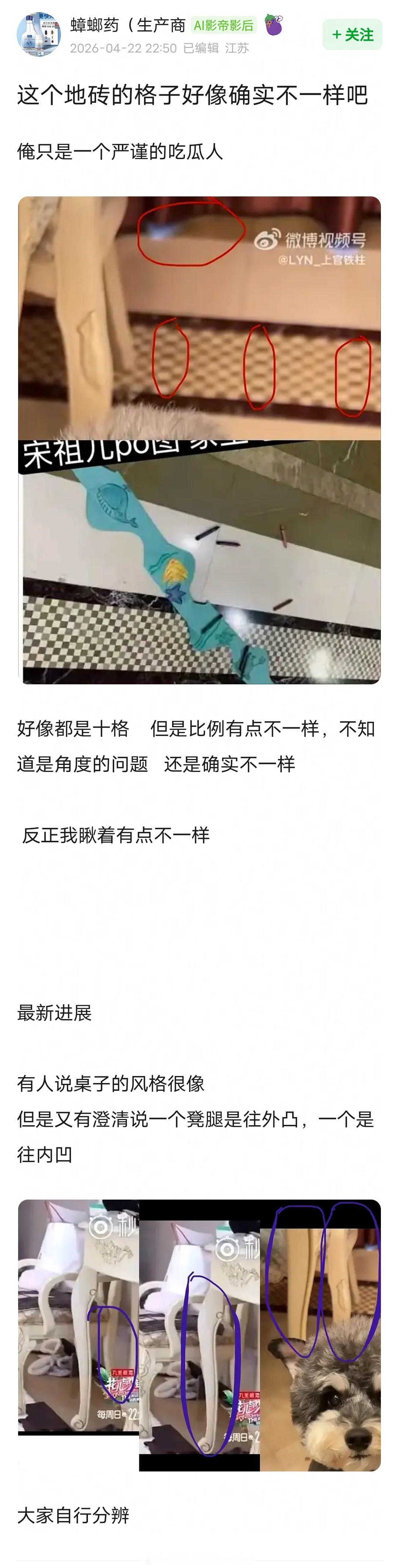 好像是cp粉扒到宋祖儿刘宇宁晒出的地板花纹很像,还有同款风格的桌椅。也有网友澄清