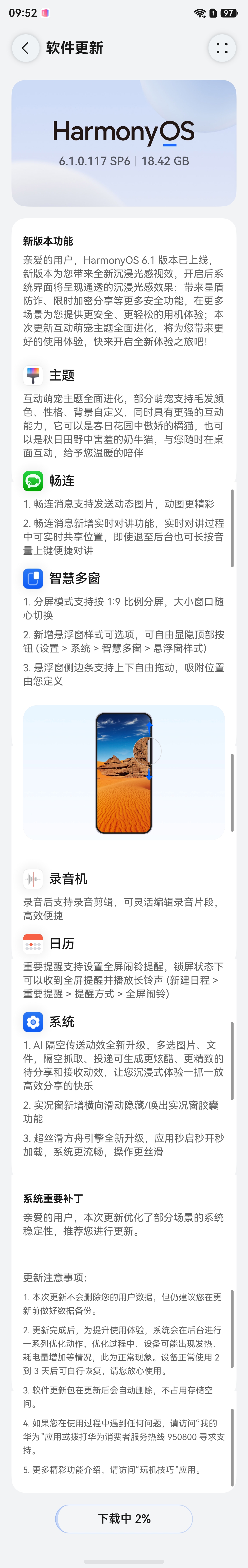 上来就18G的更新,鸿蒙6.1大更新了,第一次当主力机使用,没想到鸿蒙并没有网络黑子那样说的难用,和习惯的安卓差不多,一些功能设计还更好用。