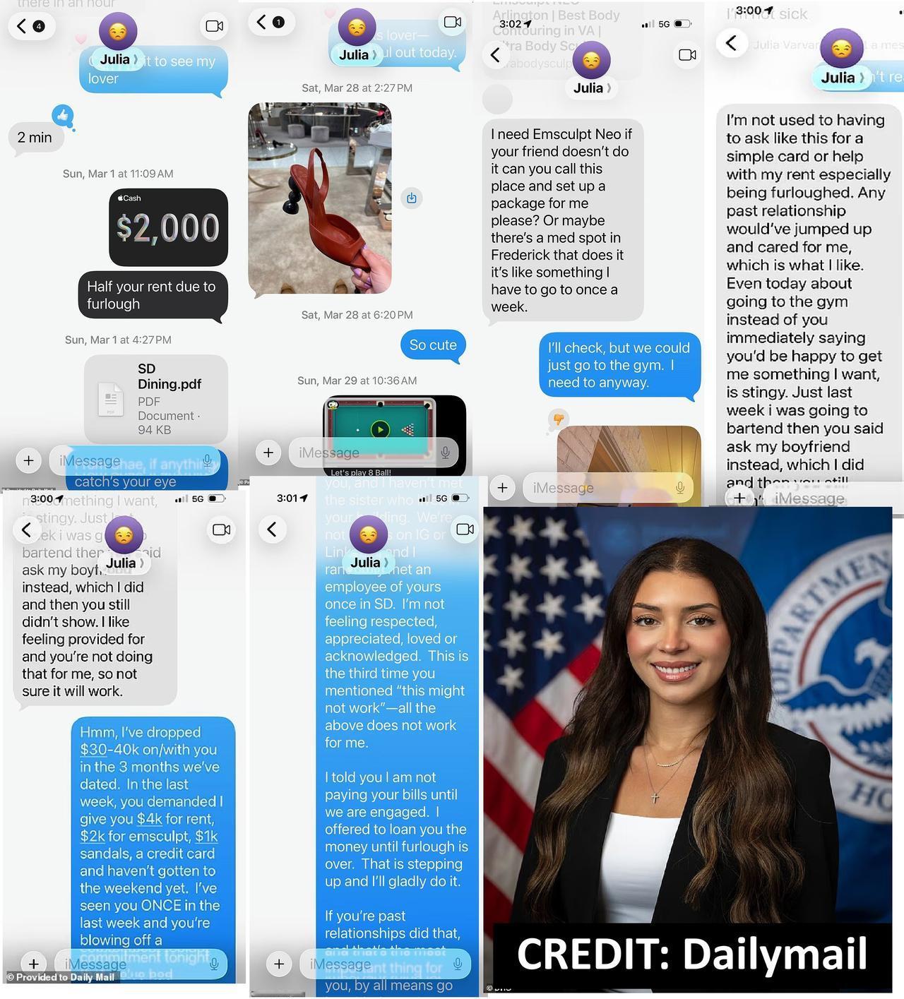 29岁美国漂亮反恐女官员:私下给别人当包养情人,挥霍无度竟然被“糖爹”投诉!近日媒体曝光称,特朗普政府国土安全部反恐副助理秘书、29岁的朱莉娅·瓦瓦罗遭前男友罗伯特·B向监察长正式投诉,指控她在短短三个月内让他花掉3万到4万美元用于奢侈旅行、卡地亚珠宝和购物。据报道,瓦瓦罗2024年才从圣约翰大学拿到国土安全博士学位,2025年5月仅28岁就获任命,靠MAGA圈活动和与特朗普合影迅速上位,却在2026年1月起通过认识罗伯特后,迅速开启“互惠”关系:从纽约米内塔酒馆1400美元晚餐,到阿鲁巴头等舱度假、意大利里维埃拉情人节、瑞士阿尔卑斯滑雪,再到米兰奢侈品购物,她不仅要求对方买单,还在短信里抱怨对方“没提供我想要的感觉”,甚至提到过去“糖爹”还帮付大学学费。罗伯特警告她吸食大麻和服用赞安诺可能危及绝密许可,她却回复“我根本不会被测试”。她还公开自称手腕耳上的珠宝是“从糖爹那里获得的战利品”,甚至在国土安全部会议上发短信炫耀“他们叫我秘书,我喜欢……我是老板公主”。对于罗伯特的指控,瓦瓦罗辩称这是“前男友报复”,否认非法用药和糖爹档案,但短信记录、求职网站旧资料以及她自己在会议上的“老板公主”自称,都让事件显得真实可信。