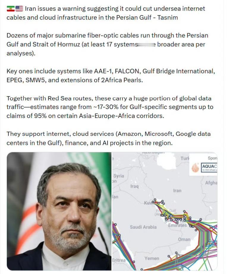 伊朗把整个海湾地区的数字基础设施都摸透了,全画在了地图上,威胁将切断海湾地区提供全球互联网连接的海底电