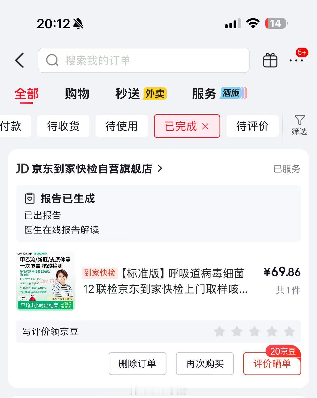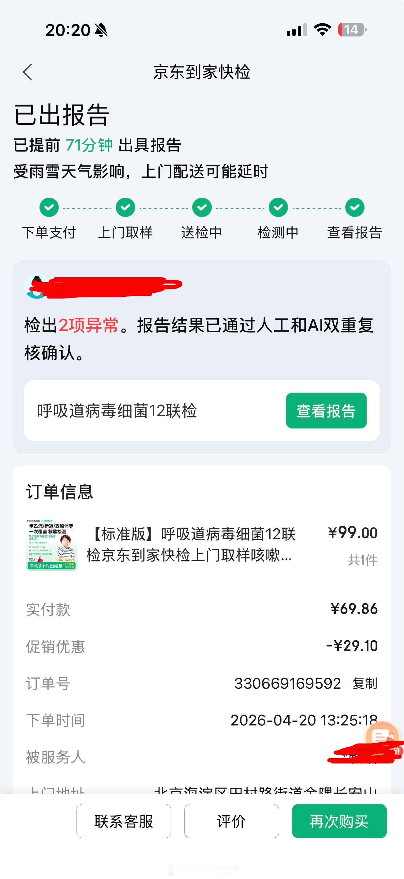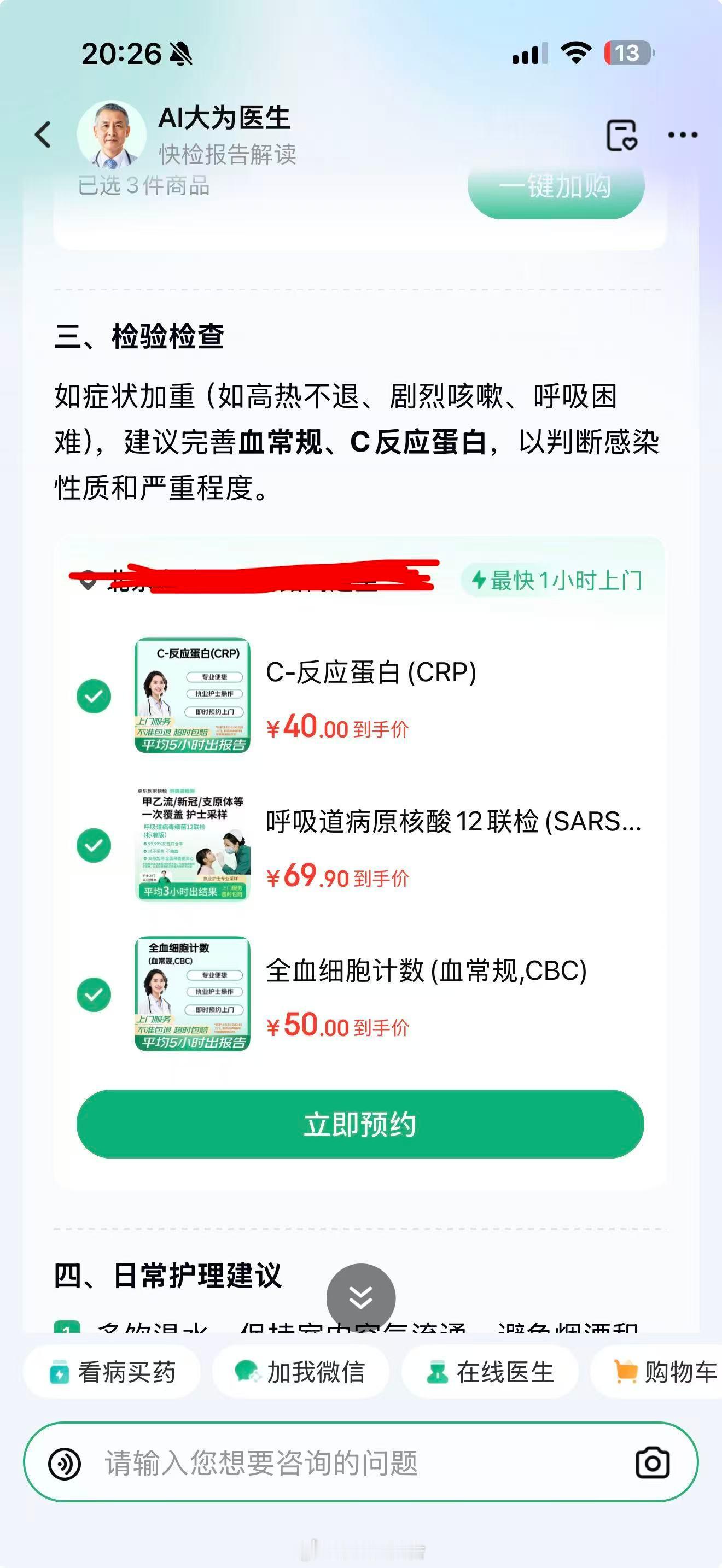 约了上门居家检测,在家就能排查流感、新冠这类传染病,是真方便,对带娃家庭太友好了。Ai问诊后,若症状加重,还可以直接上门抽血,不用跑医院。