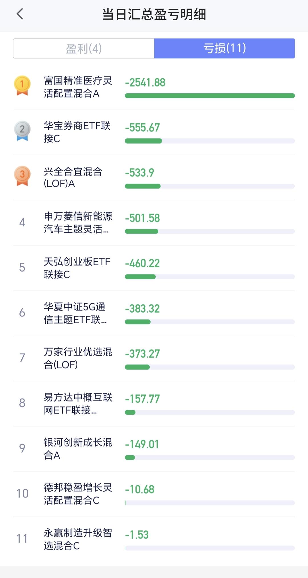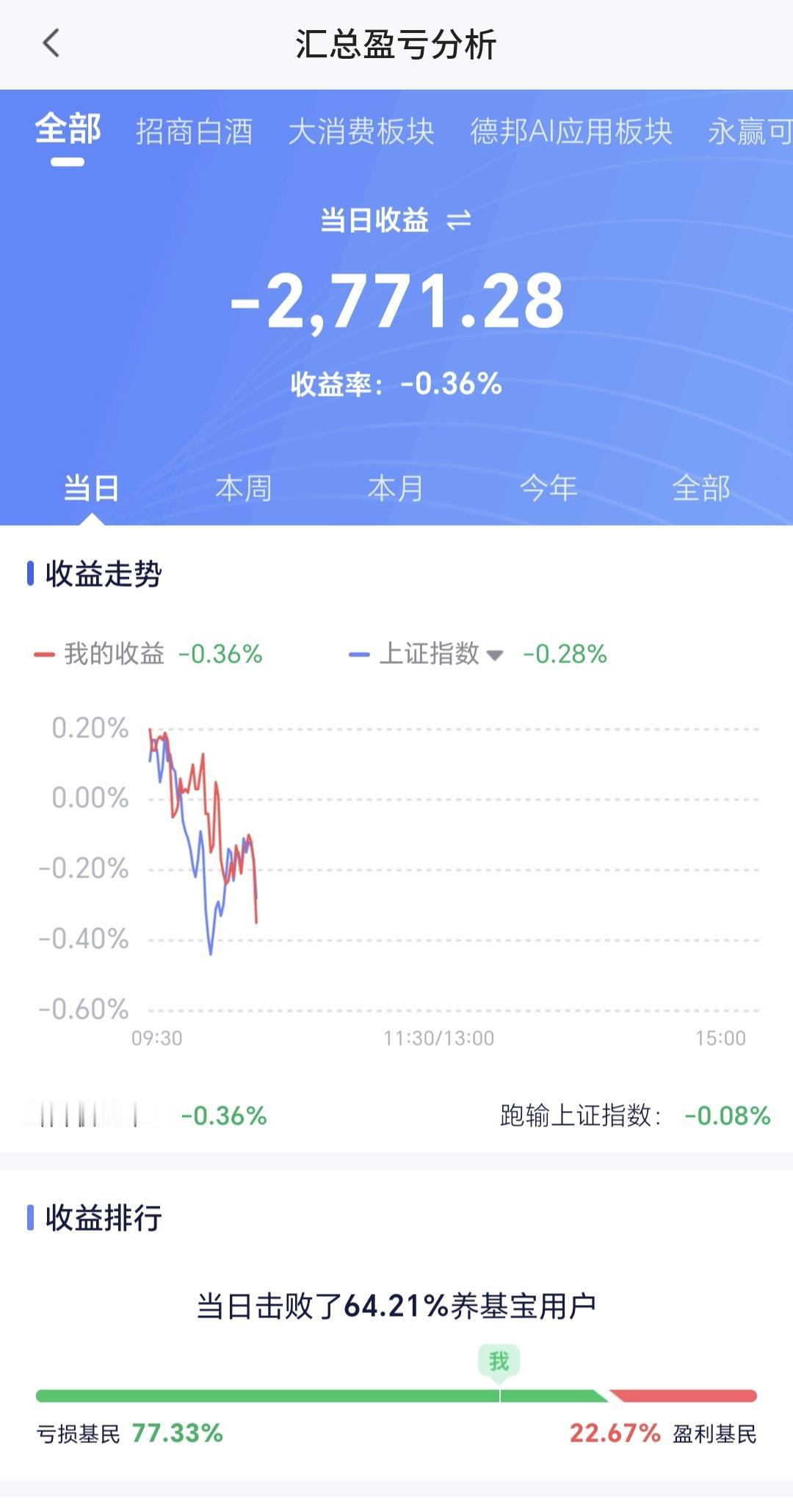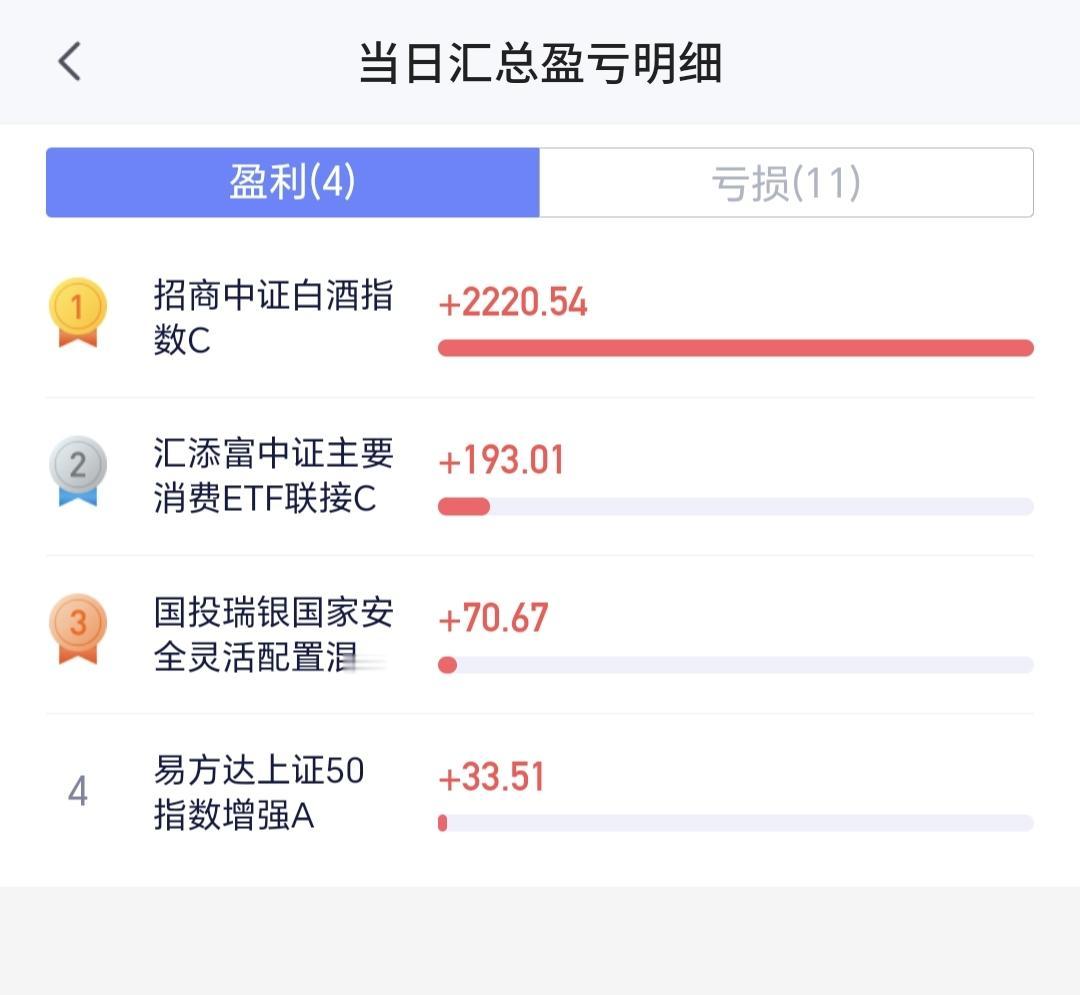 持有基金现在盘中估值亏损了2771元,盈利金额最大的三个板块是:白酒板块,大消费板块,军工板块,亏损金额最大的三个板块是:创新药板块,证券板块,沪港深消费板块。