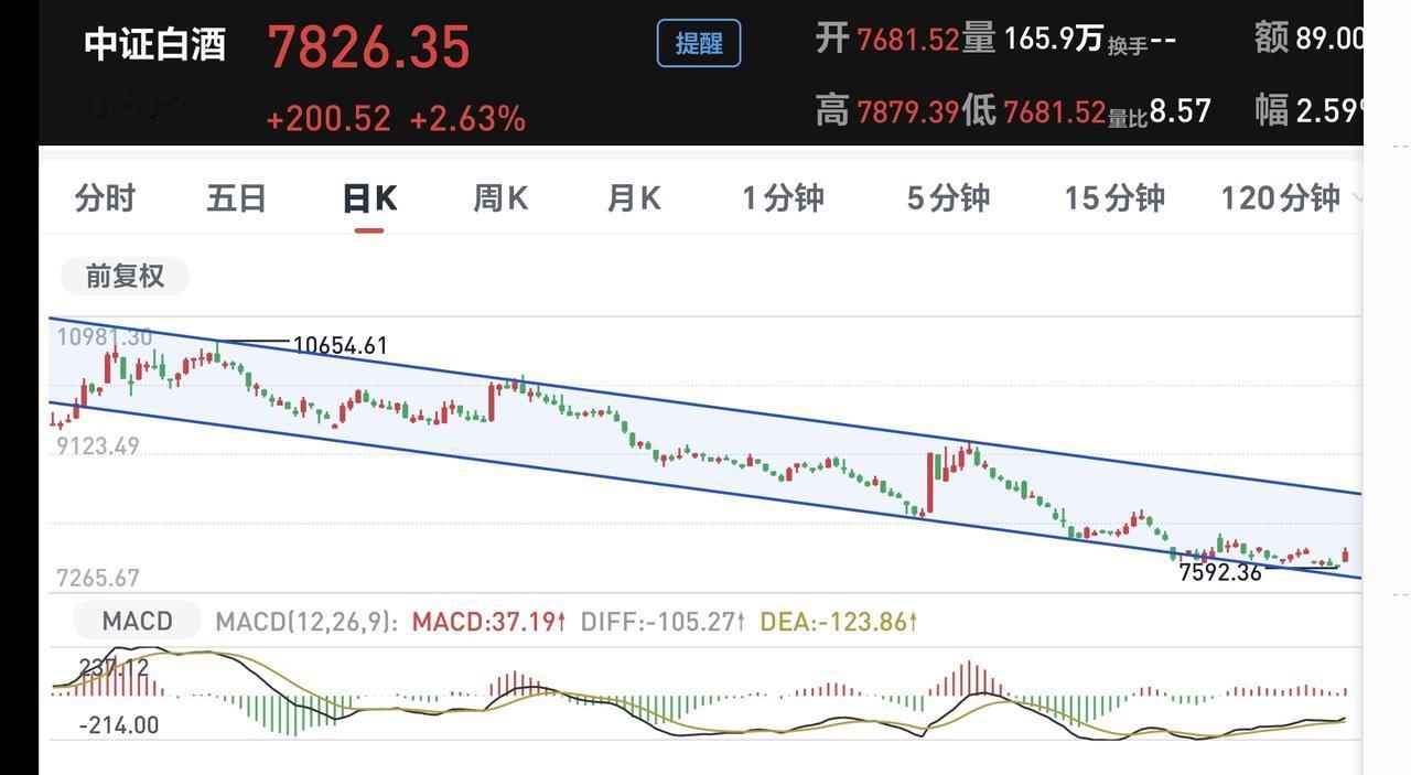 白酒板块日线级别处于下跌通道中,距离下跌通道的下轨线更近一些,上次在下跌通道下轨线附近的时候,我进场了10000块钱,但今天的上涨并没有能够突破这个下跌通道的上轨线,今天的上涨并没有改变这个板块日线级别的下跌趋势,今天的上涨并没有表明这个板块已经反转,这样的位置可以持续定投,我是每天定投200块钱。
