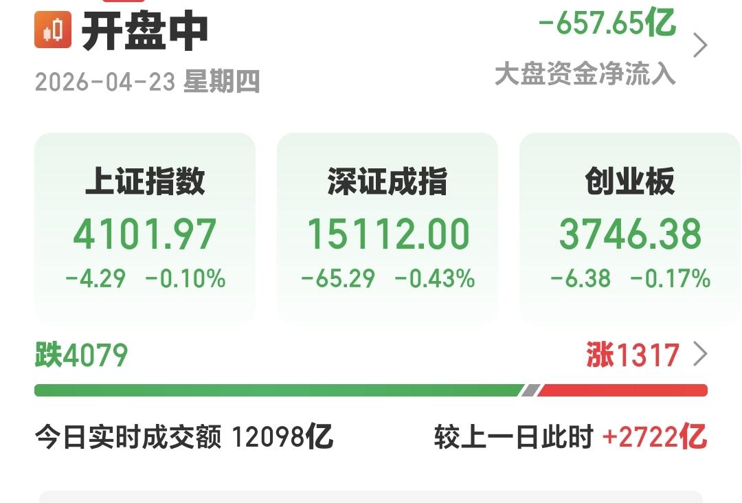 整个股票市场,上涨1317家,下跌4079家,两市累计成交12098亿,相比于上一个交易日同期放量了2022亿,主力资金净流出657亿。