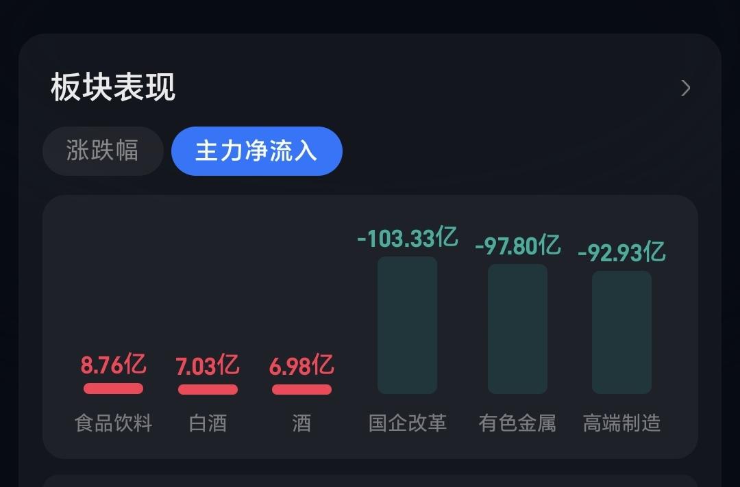 主力资金净流入最多的三个板块是:食品饮料板块,白酒板块,酒板块,主力资金净流出最多的三个板块是:国企板块,有色金属板块,高端制造板块。
