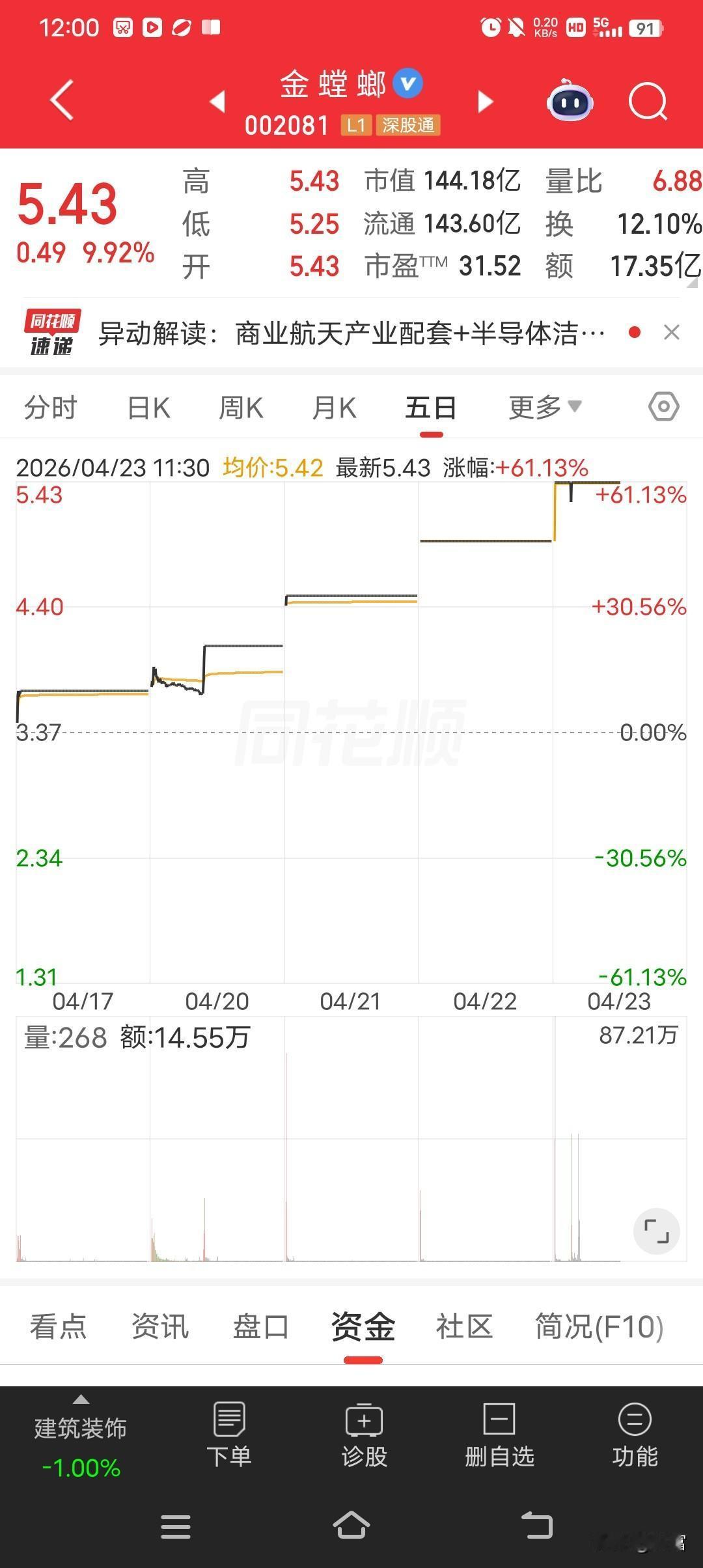 金螳螂这波操作太猛了,最新价5.43强势涨停,还取得了5连板!2026年4月23日的消息,它5天累计涨幅达61.13%。当天开盘,市场主要指数集体高开,不过个股涨跌不一,开盘有1954只个股上涨,2717只下跌。涨停股里金螳螂很亮眼,还有*ST中迪8天5板、*ST原尚4连板等。从股价连续性看,昨日涨停股里今日开盘继续涨停的有安诺其等5只。金螳螂这5连板不知道后续还能不能继续牛下去,不过股市有风险,投资还是得谨慎呐。
