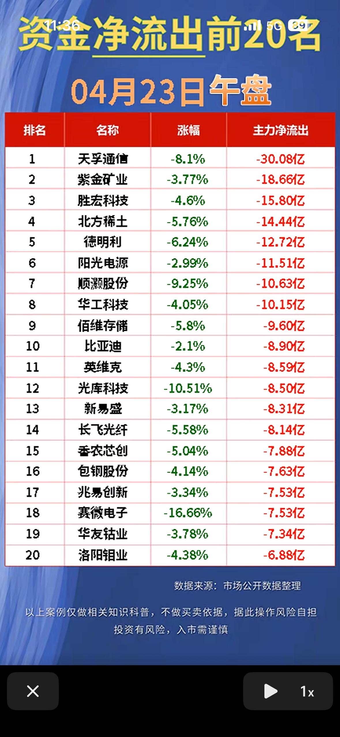 4月23日午盘资金净流入与净流出前20名股票,涨跌榜一览!