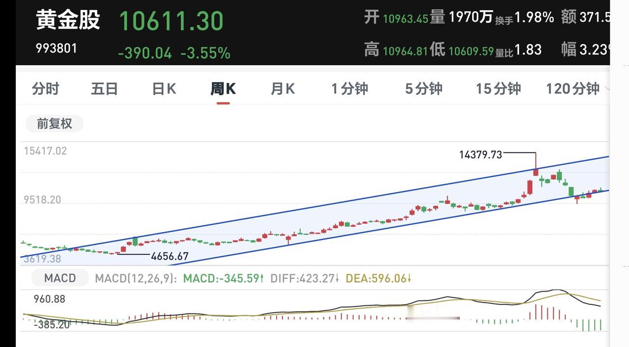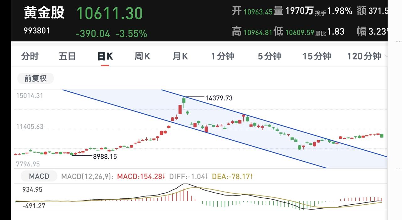 黄金股板块周线级别处于上涨通道中,连续两天的下跌来到了这个上涨通道的下轨线上,近期观察会不会继续下跌,如果有效破位这条下轨线,长线持有的人需要注意风险。