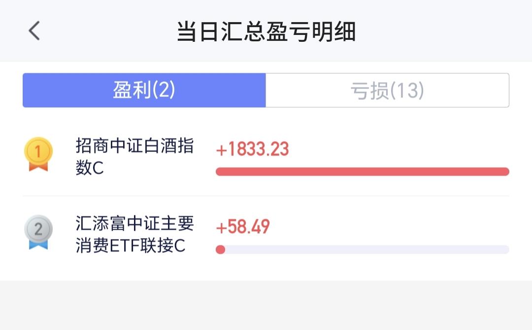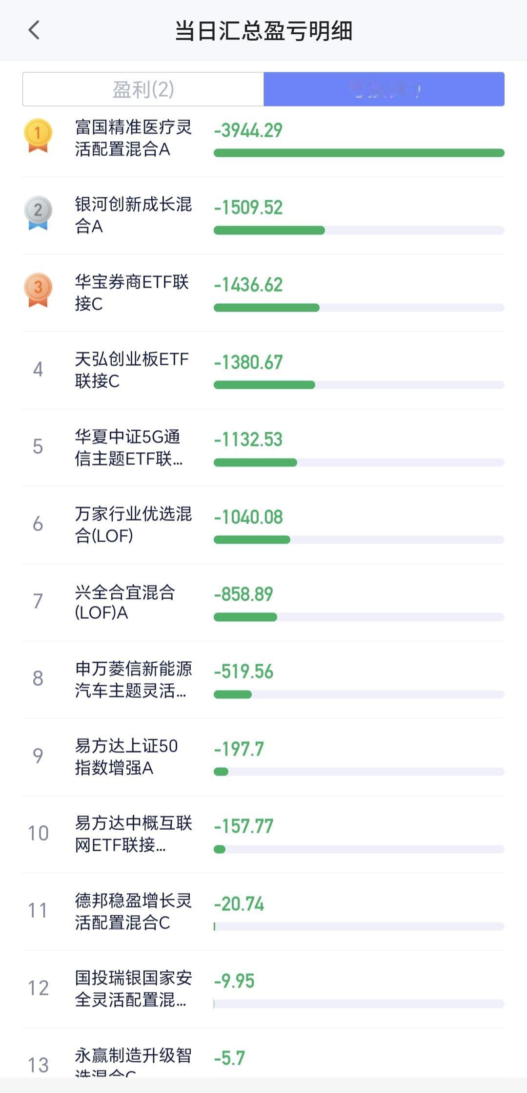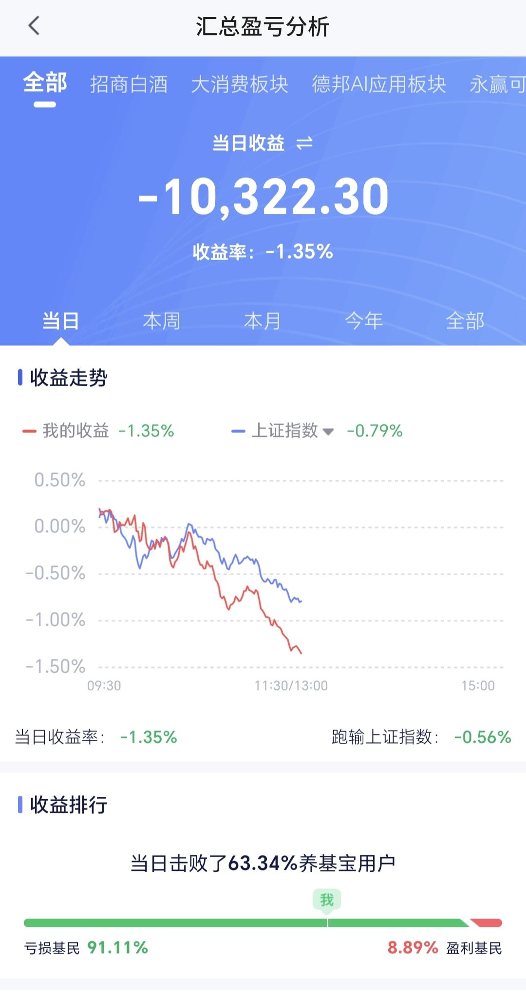 持有基金现在盘中估值亏损了10322元,盈利的只有白酒板块和大消费板块,亏损金额最大的三个板块是:创新药板块,芯片半导体板块,证券板块。