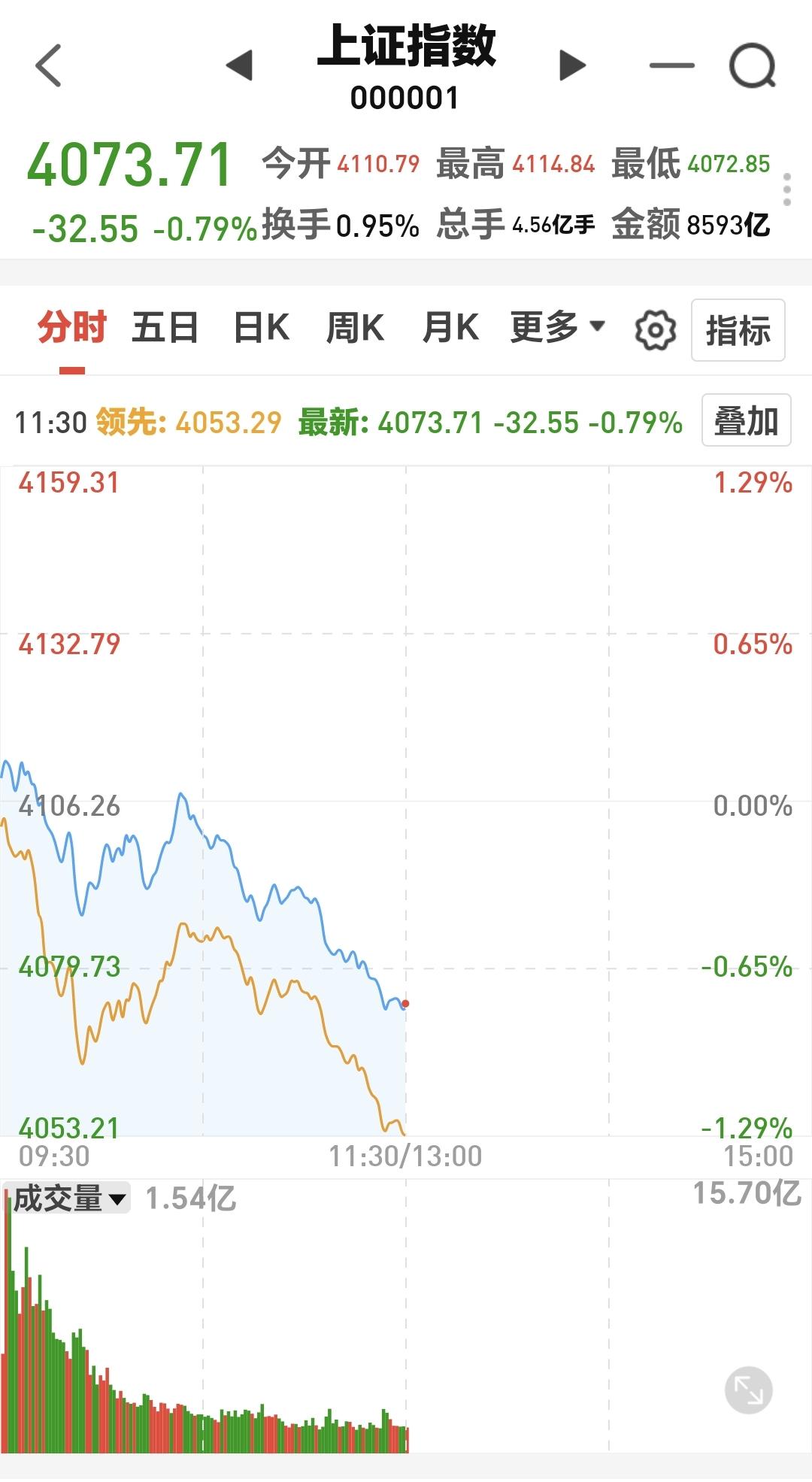 今天市场高开低走,中午收盘的时候,三大指数都是下跌,创业板指和深成指下跌幅度都超过了1%以上,创业板指下跌了1.83%,收于3684点,上证指数下跌了0.79%,收于4073点。