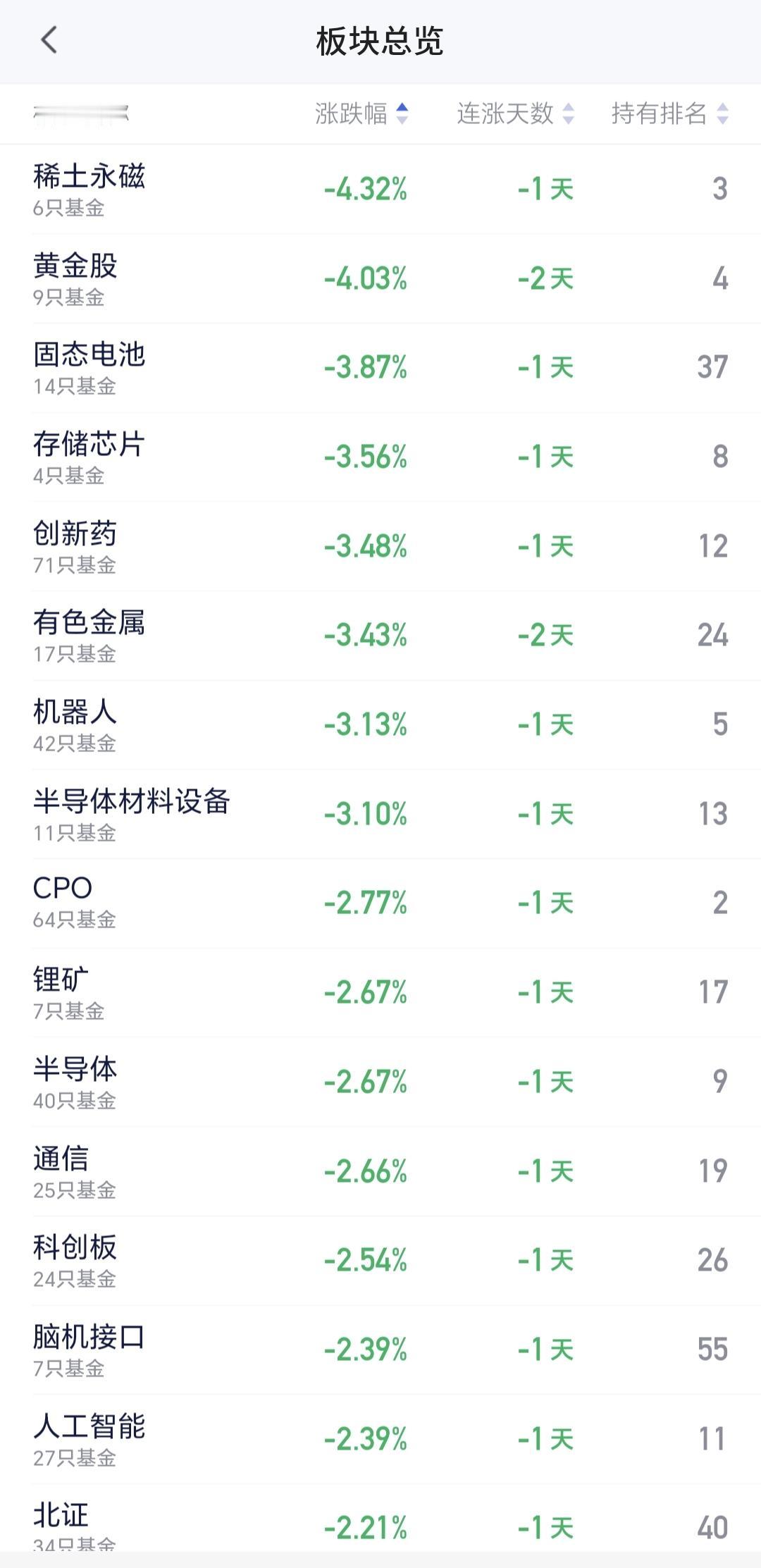 黄金股板块今天也是大跌,现在盘中估值下跌了4.03%,是连续第二个交易日下跌,持有人数在所有板块当中排名第四位。