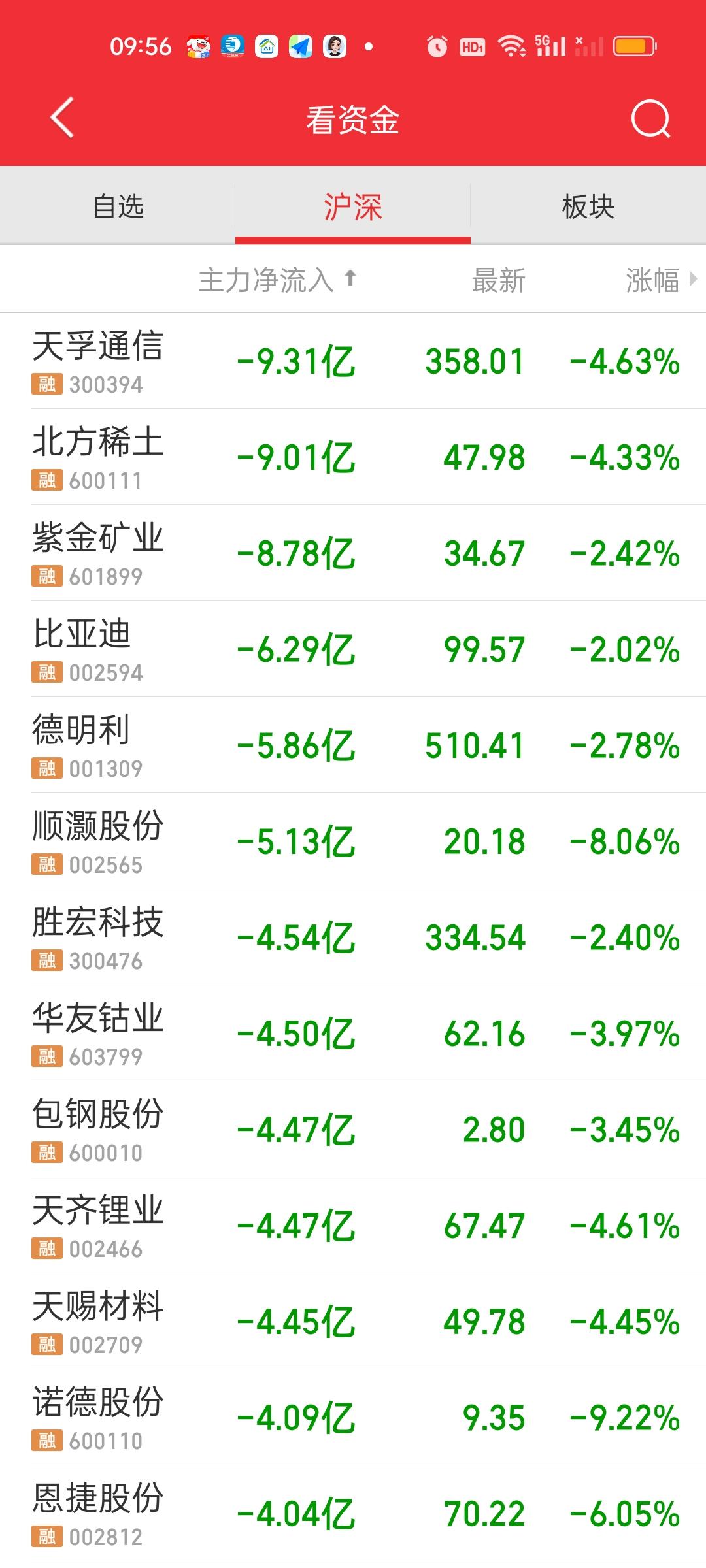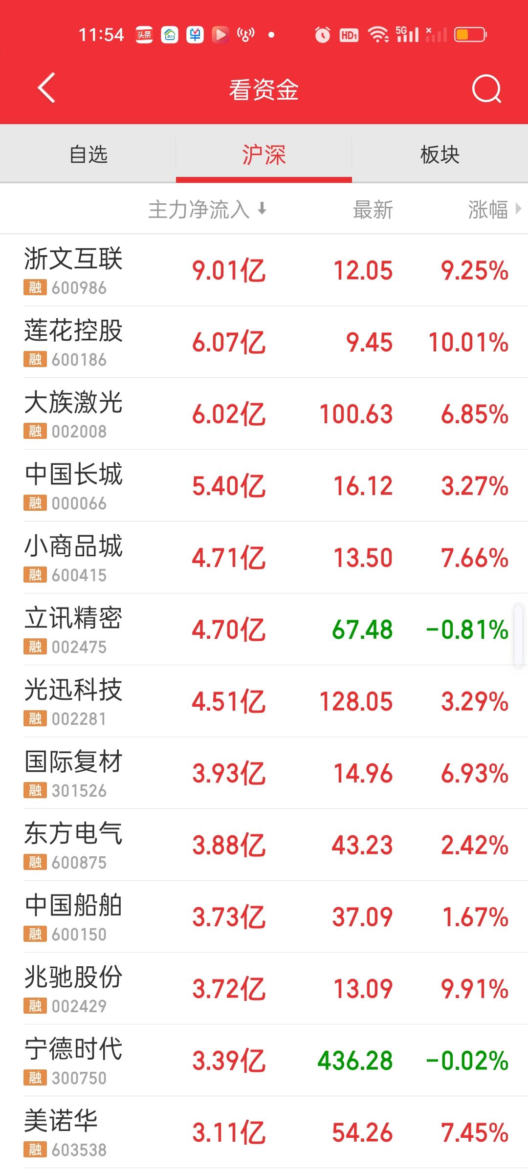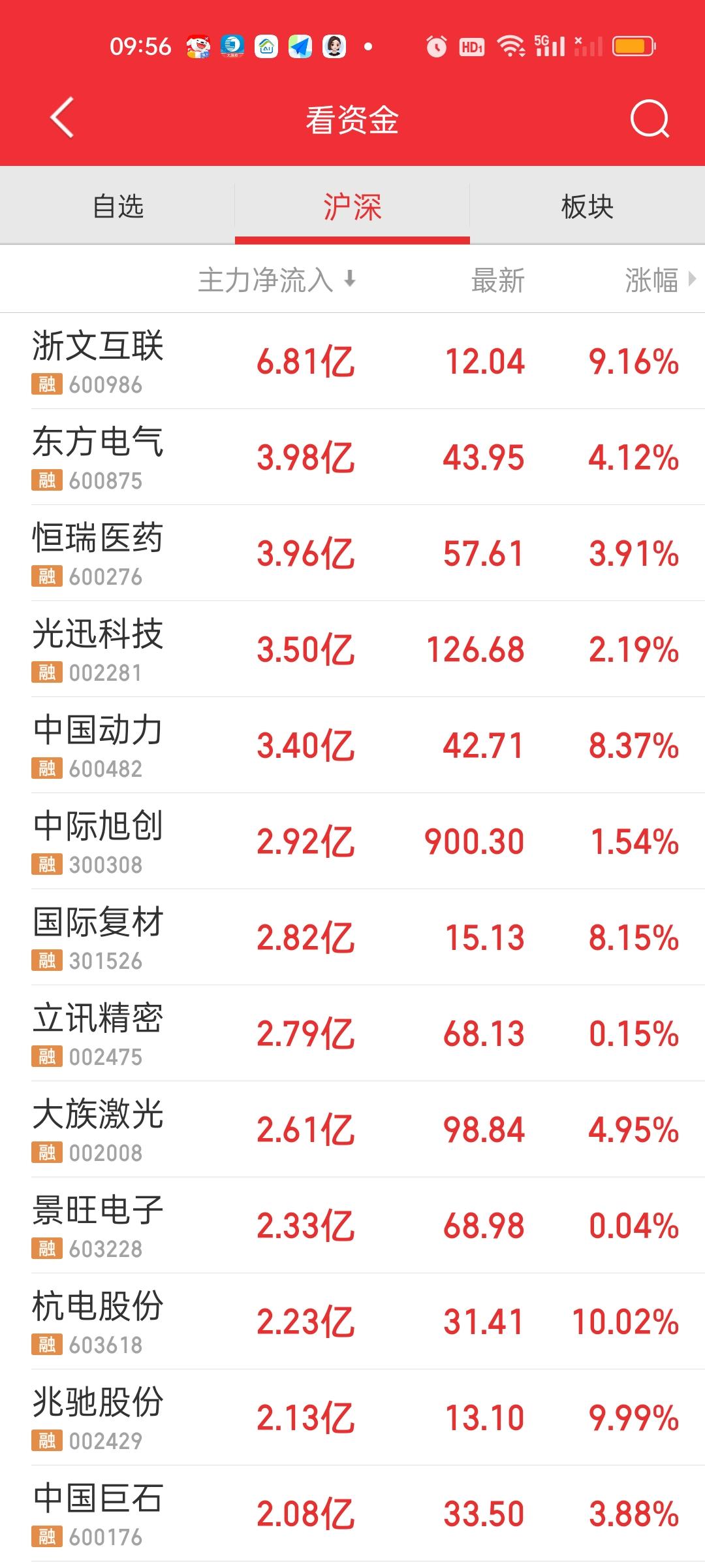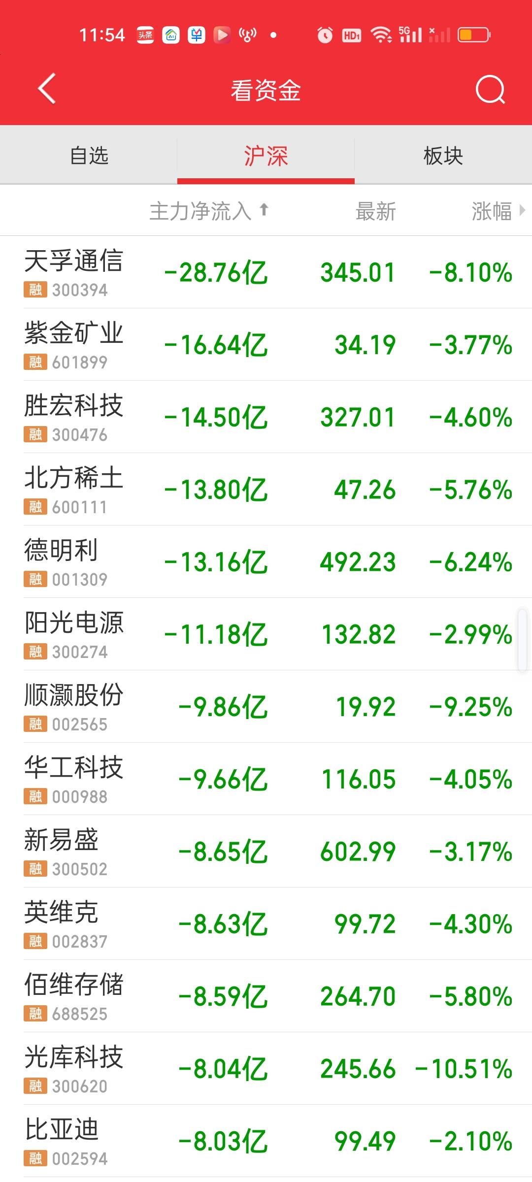 主力资金净流入方面,上午收盘还没有资金净流入超10亿的,只有浙文互联很接近。主力资金净流出超10亿的个股有天孚通信,紫金矿业,胜宏科技,北方稀土,德明利,阳光电源。顺灏股份,华工科技,新易盛,英维克,佰维存储也很接近。