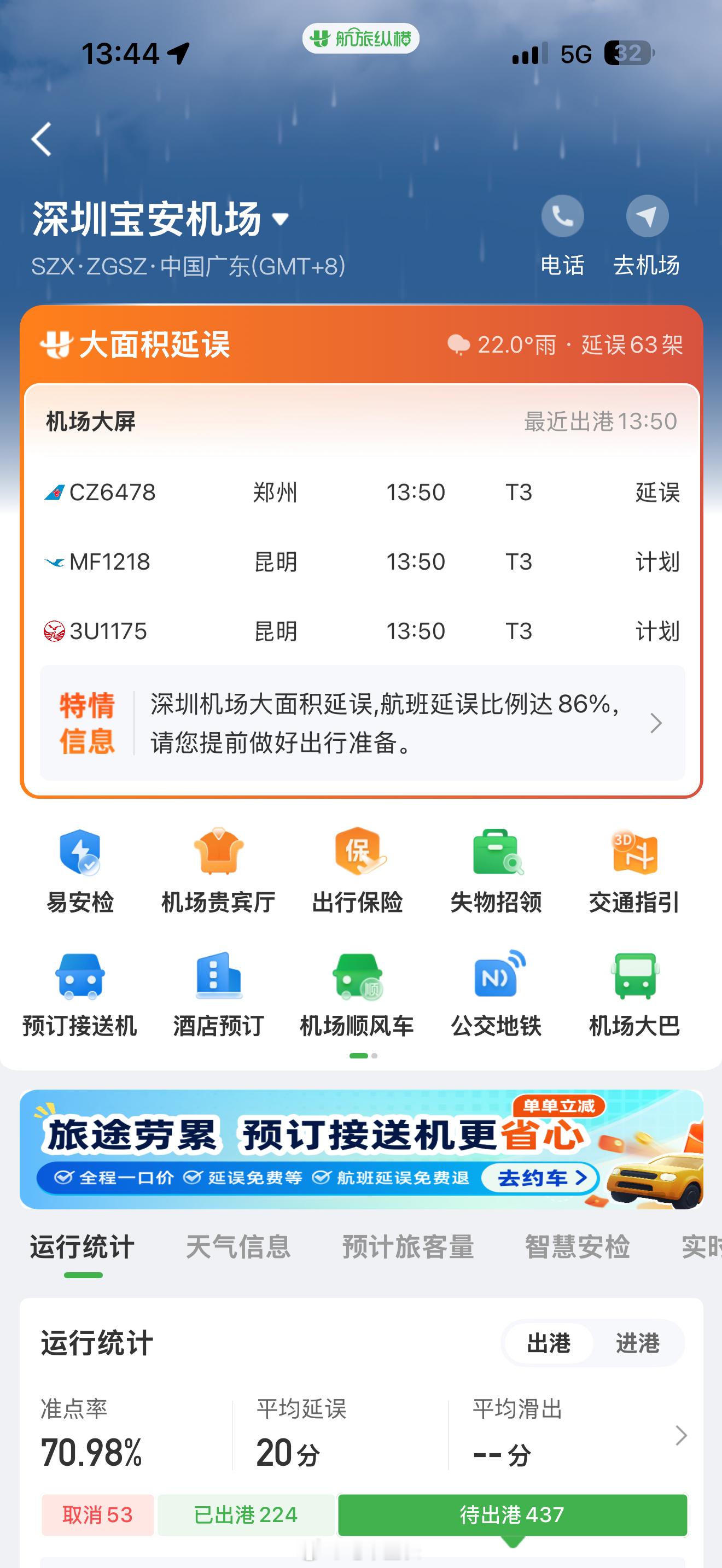 深圳机场、广州机场大规模延误我们是早上8.15的飞机正常起飞了后面十点过后的至少得延误一个半小时