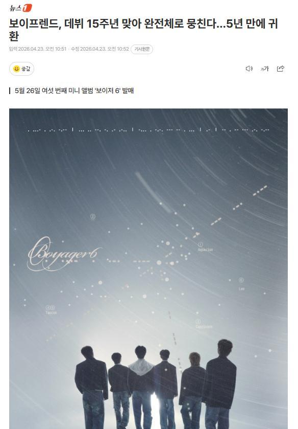 23日BOYFRIEND方面表示,将于5月26日发行纪念出道15周年的新迷你专辑《Boyager 6》,重新回到粉丝们身边。时隔5年以完整体回归的BOYFRIEND将以丰富多彩的活动来纪念组合出道15周年。