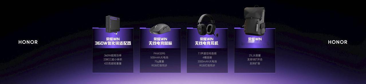 本次荣耀发布会 除了旗舰机型H9,还推出H7机型,形成覆盖不同档位的产品矩阵外,还带来了荣耀WIN 360W氮化镓适配器、荣耀WIN无线电竞鼠标、荣耀WIN无线电竞耳机、荣耀WIN多功能双肩背包、荣耀WIN笔记本散热支架等产品。