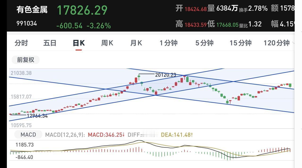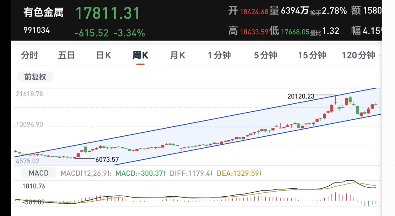 有色金属板块周线级别处于上涨通道中,今天的下跌并没有跌破这个上涨通道的下轨线,今天的下跌并没有改变这个板块周线级别的上涨趋势,长线持有的人继续持有。