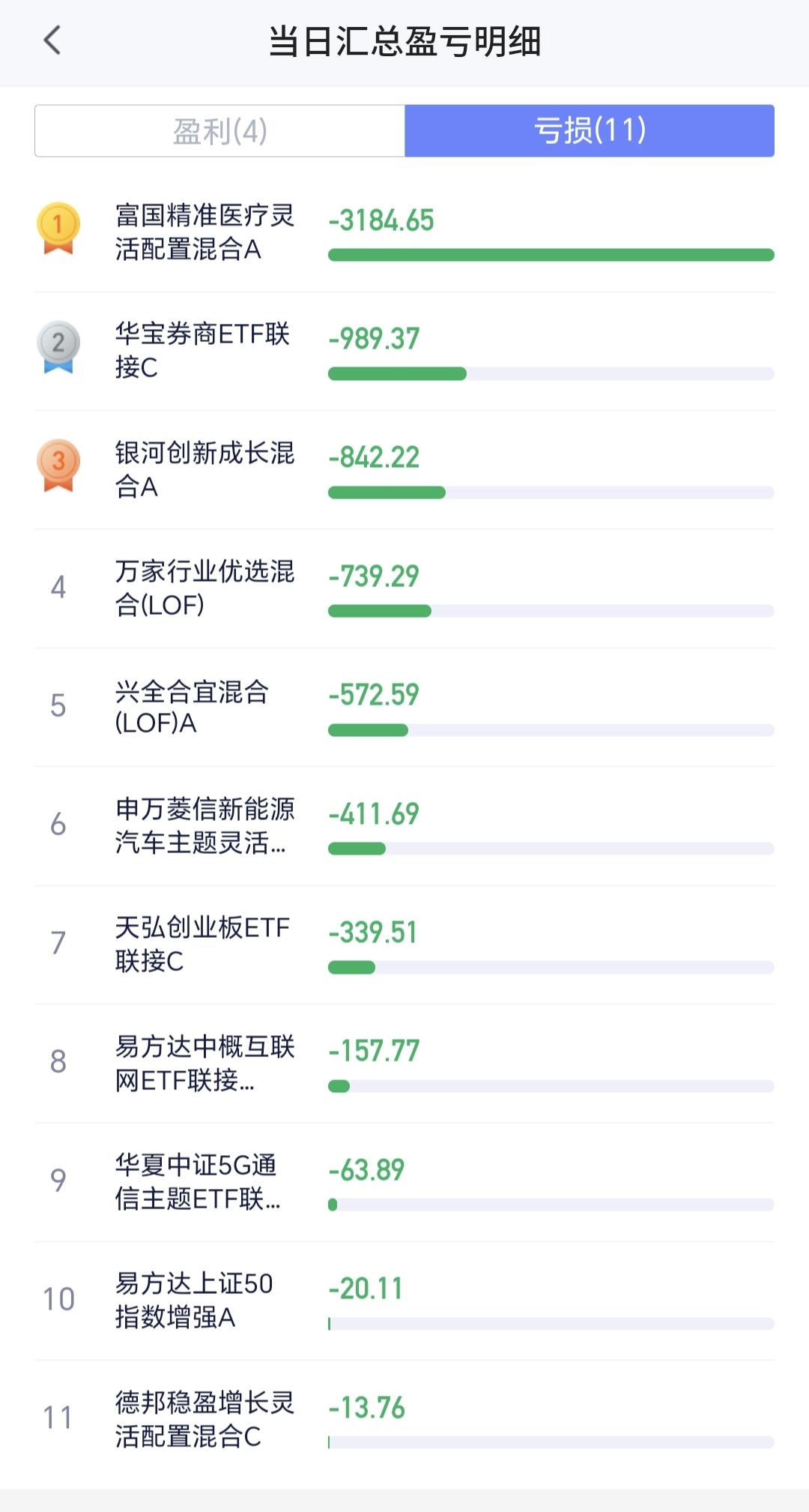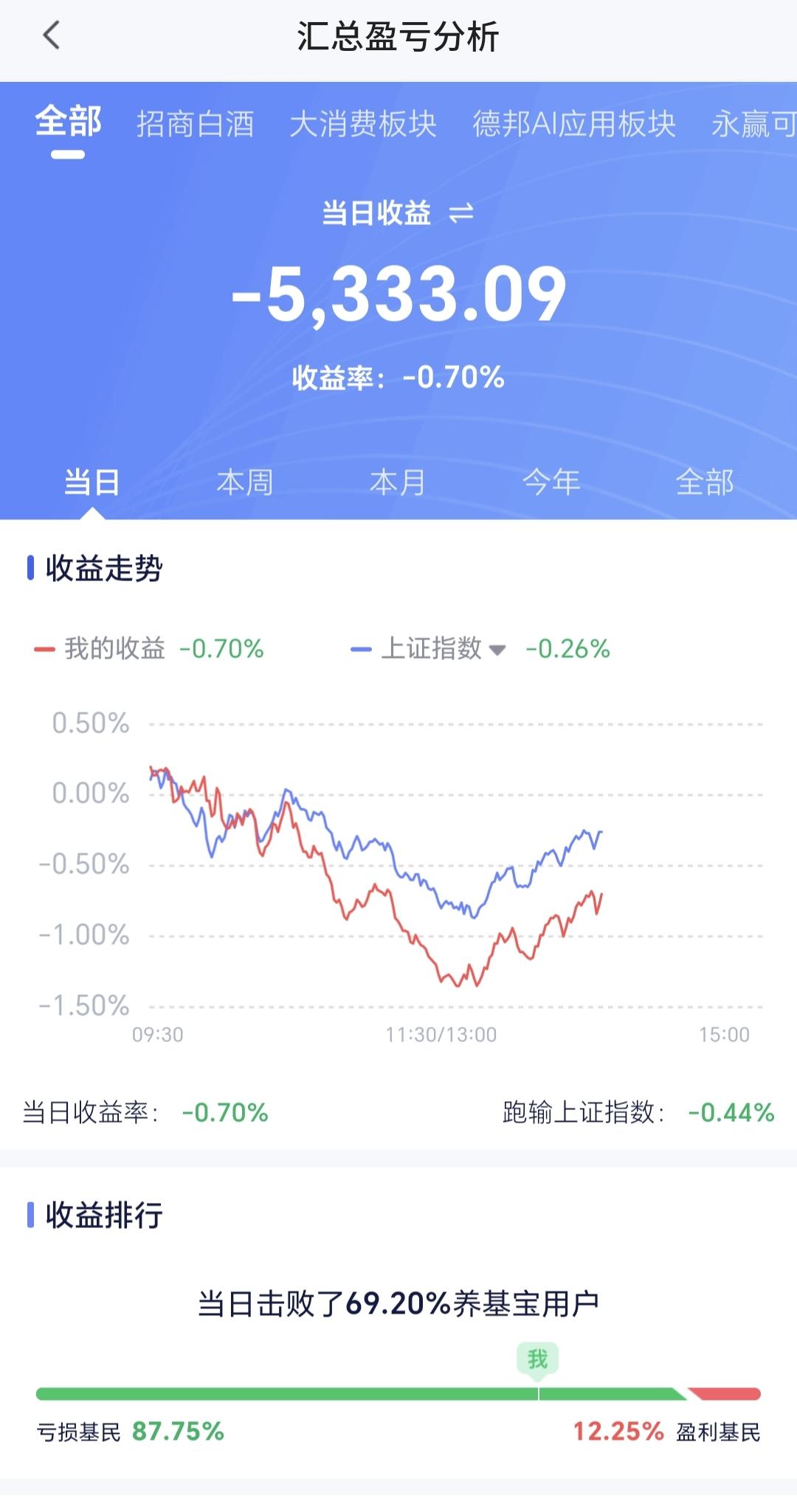 持有基金现在盘中估值亏损了5333元,盈利金额最大的三个板块是:白酒板块,大消费板块,军工板块,亏损金额最大的三个板块是:创新药板块,证券板块,芯片半导体板块。
