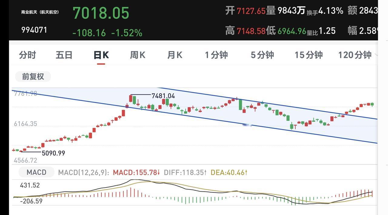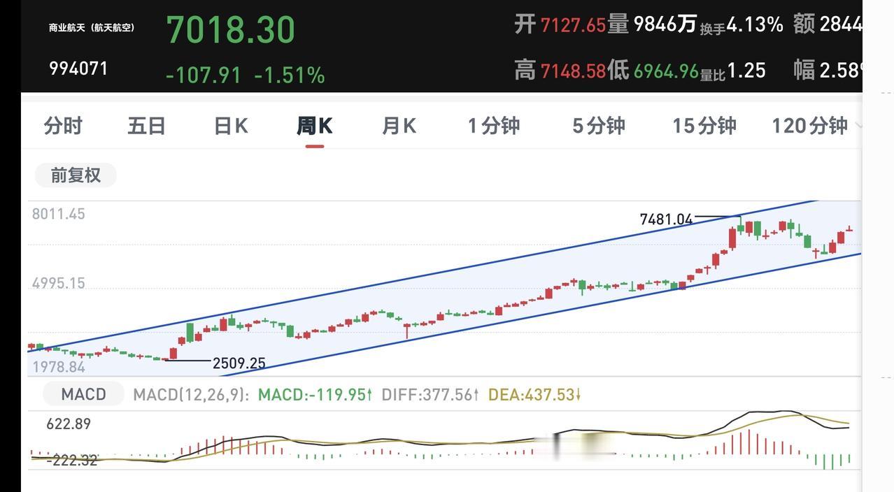 商业航天板块周线级别处于上涨通道内,今天的小幅度下跌并没有改变这个板块周线级别的上涨趋势,长线持有的人可以继续持有,只有下跌跌破了这个上涨通道的下轨线,长线持有的人才可以考虑要不要止盈出来观望。