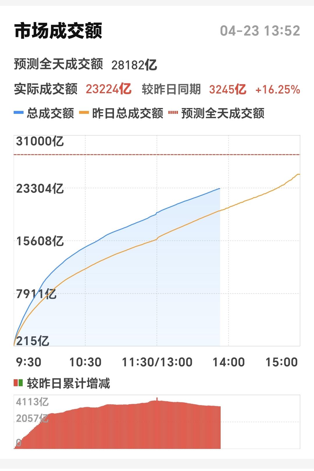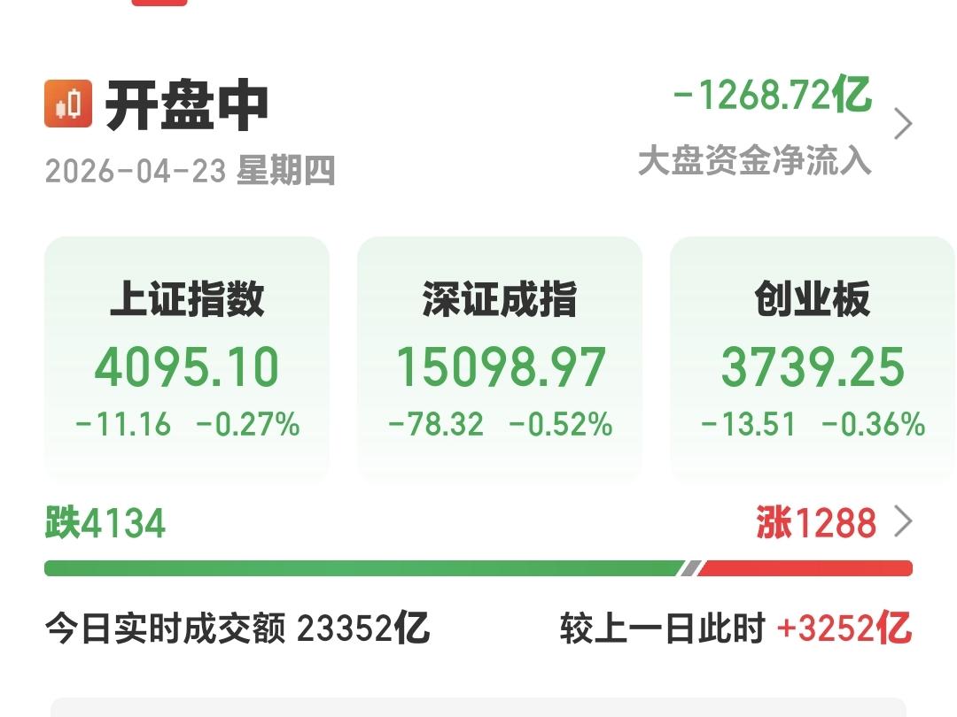 整个股票市场,上涨1288家,下跌4134家,两市累计成交23352亿,相比于上一个交易日同期放量了3252亿,全天成交量预估28182亿,主力资金净流出1268亿。