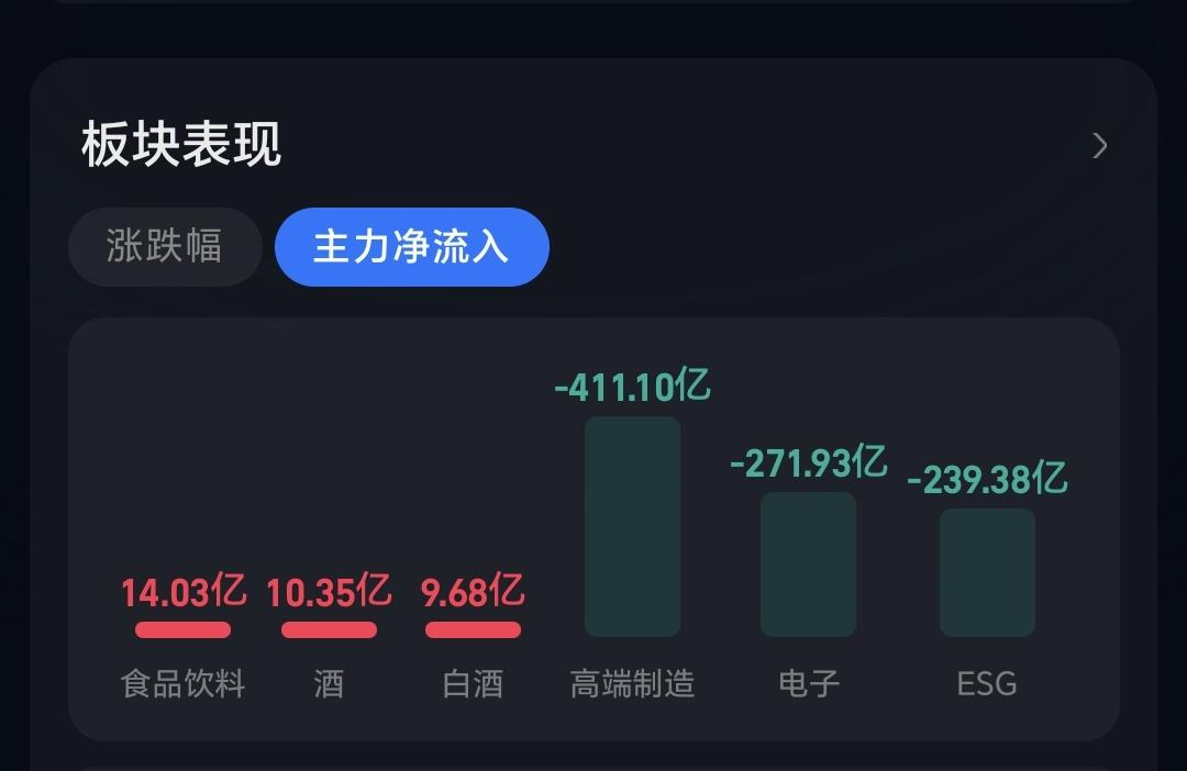 主力资金净流入最多的三个板块是:食品饮料板块,酒板块,白酒板块,主力资金净流出最多的三个板块是:高端制造板块,电子板块,esg板块。