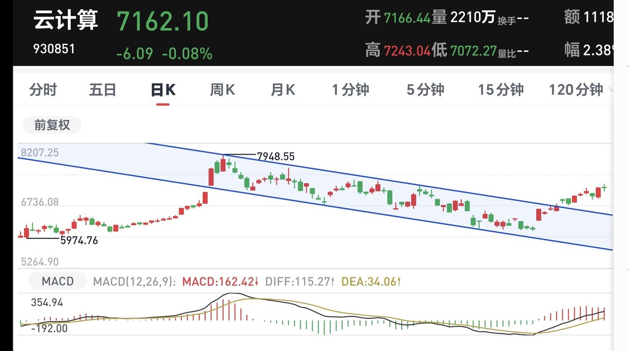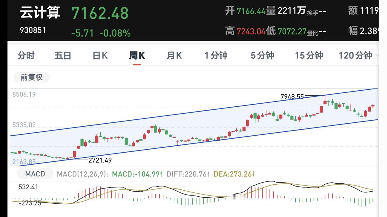 云计算板块周线级别处于上涨通道内,今天的下跌并没有跌破这个上涨通道的下轨线,今天的下跌并没有改变这个板块周线级别的上涨趋势,长线持有的人可以继续持有。