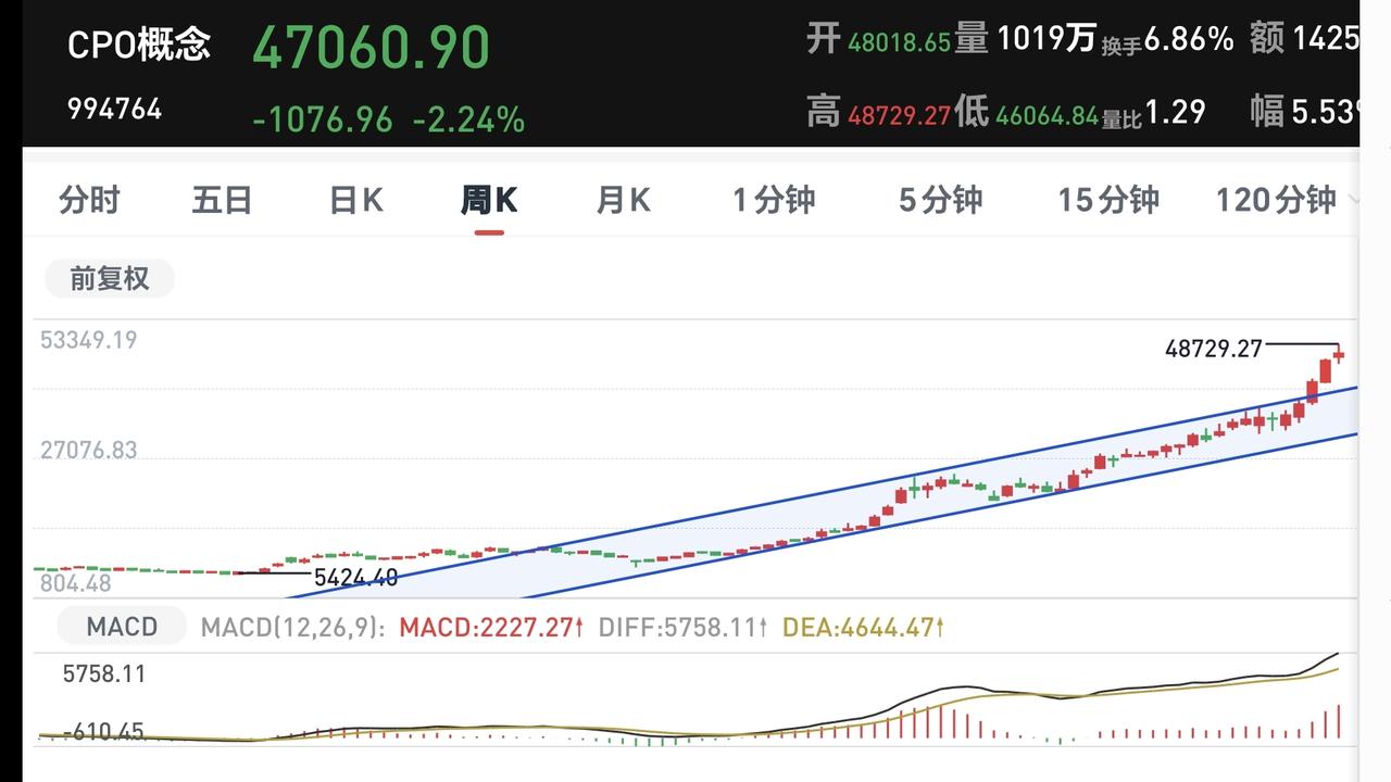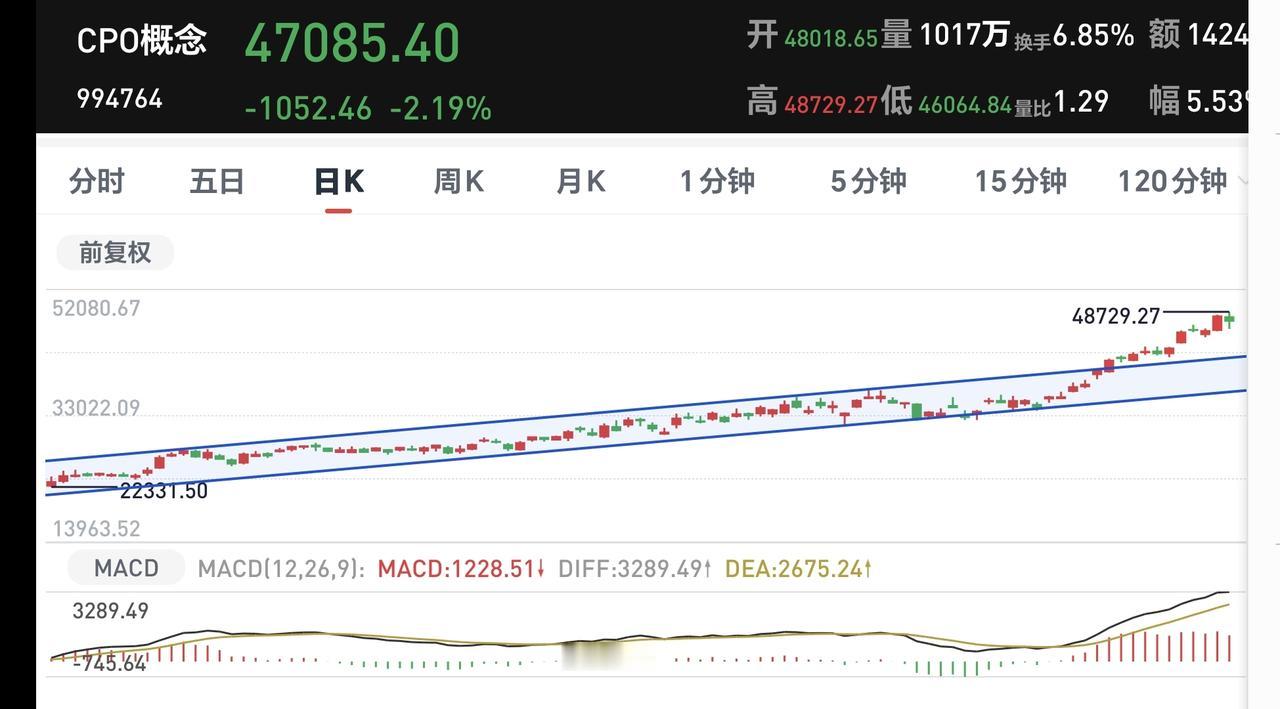 Cpo板块日线级别和周线级别都处于上涨趋势中,今天的下跌并没有跌破这个上涨通道的下轨线,今天的下跌并没有改变这个板块的下跌趋势,持有的人可以继续持有,但按照现在的位置看,收的是一个高位十字星,这个地方肯定是不可以进场的。