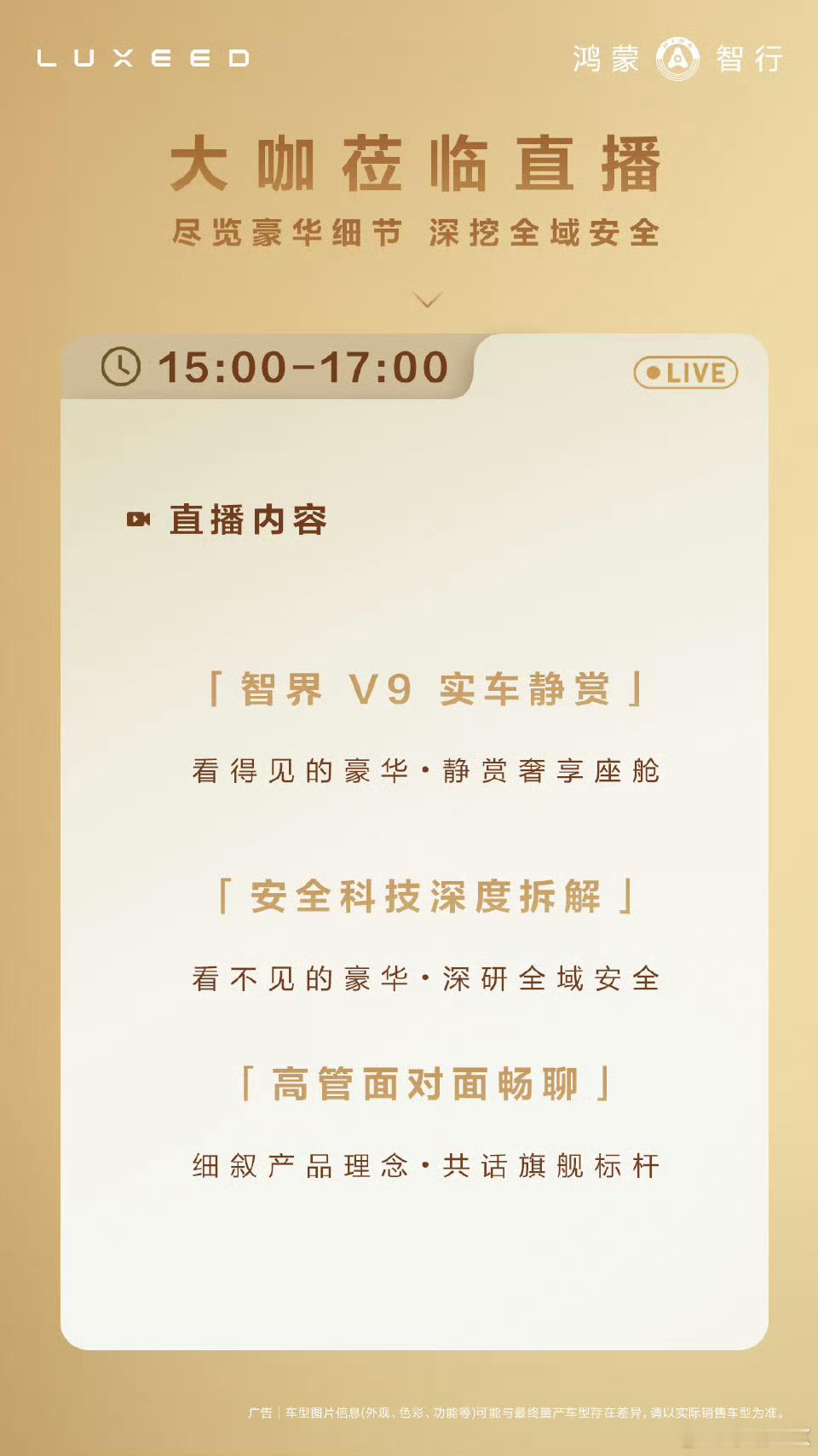 智界V9的视频要过段时间发,先来几张照片「智界汽车」正在直播全方位解密全景智慧旗舰MPV智界V9,感兴趣的朋友快来看看