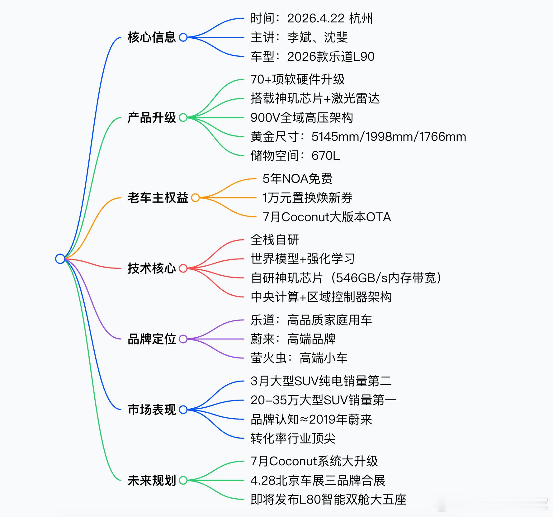 2026 年 4 月 22 日,乐道 L90在杭州举办媒体面对面活动,李斌与沈斐核心回应技术下放、老车主权益、产品迭代、品牌定位、市场竞争等问题,明确2026 款 L90 完成 70 + 项软硬件升级,坚持科技为家的家庭用车定位,依托蔚来全栈自研与900V 高压架构打造核心竞争力,同时推出老车主 5 年 NOA 免费、1 万元焕新券等权益,兼顾新老用户与品牌可持续经营,乐道品牌正步入技术全面赋能的稳健发展阶段。