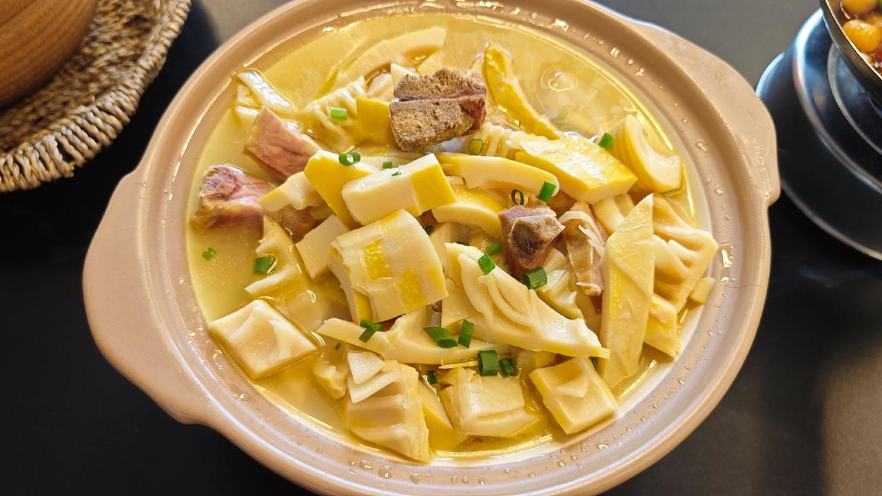 吃的更是地道,每一口都是上墅的风土。竹林鸡汤炖了好几个钟头,汤色金黄透亮,鸡肉嫩而不柴,是山里散养土鸡的鲜,喝上一碗,从喉咙暖到胃里。春笋烧肉是时令限定,刚挖的笋脆嫩鲜甜,和土猪肉一起焖得入味,肥而不腻,这是安吉春天独有的味道。还有手工笋干、时令野菜,做法不花哨,就是农家最传统的烧法,食材新鲜,味道就错不了。