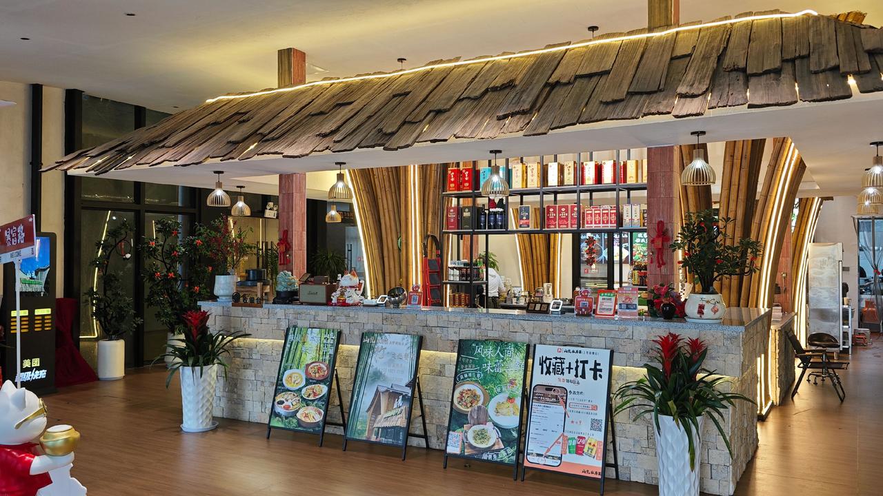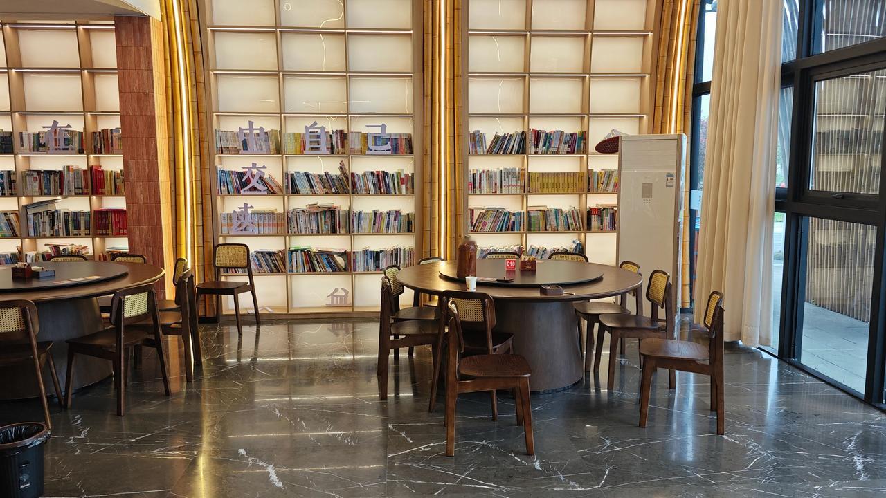 一进门就被震撼,竹编的穹顶层层叠叠,阳光透下来碎成一片光斑,像把整片竹海都搬进了屋里。墙面嵌着旧木与书册,不刻意奢华,却处处是巧思,把安吉的竹韵、上墅的文气,都藏在这些细节里。老板说,这些竹艺都是找本地老匠人做的,手工编了好几个月,不是机器能比的温度,就像这山里的人情,实在又暖心。