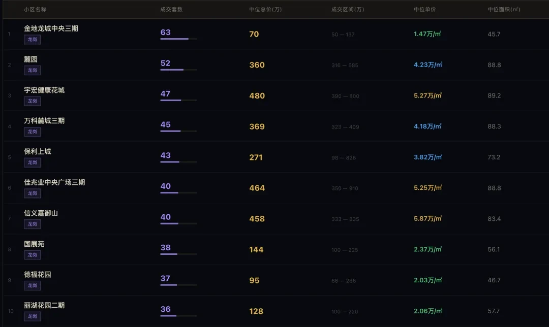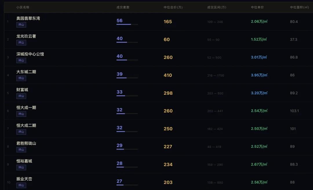 ✨从成交量看,真正扛成交的不是南山,而是龙岗5064套、福田4376套,然后才是南山2576套、宝安2386套、龙华2183套、罗湖/盐田2144套。光明和坪山也有成交,但量级明显更弱。