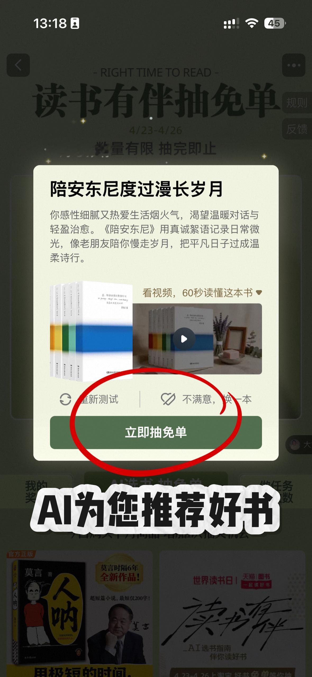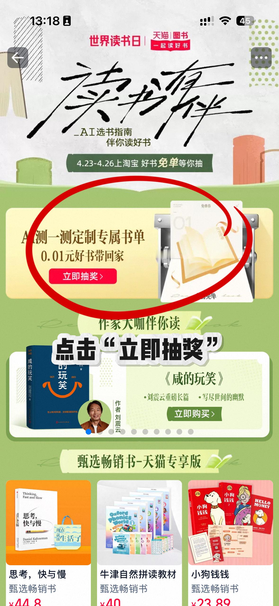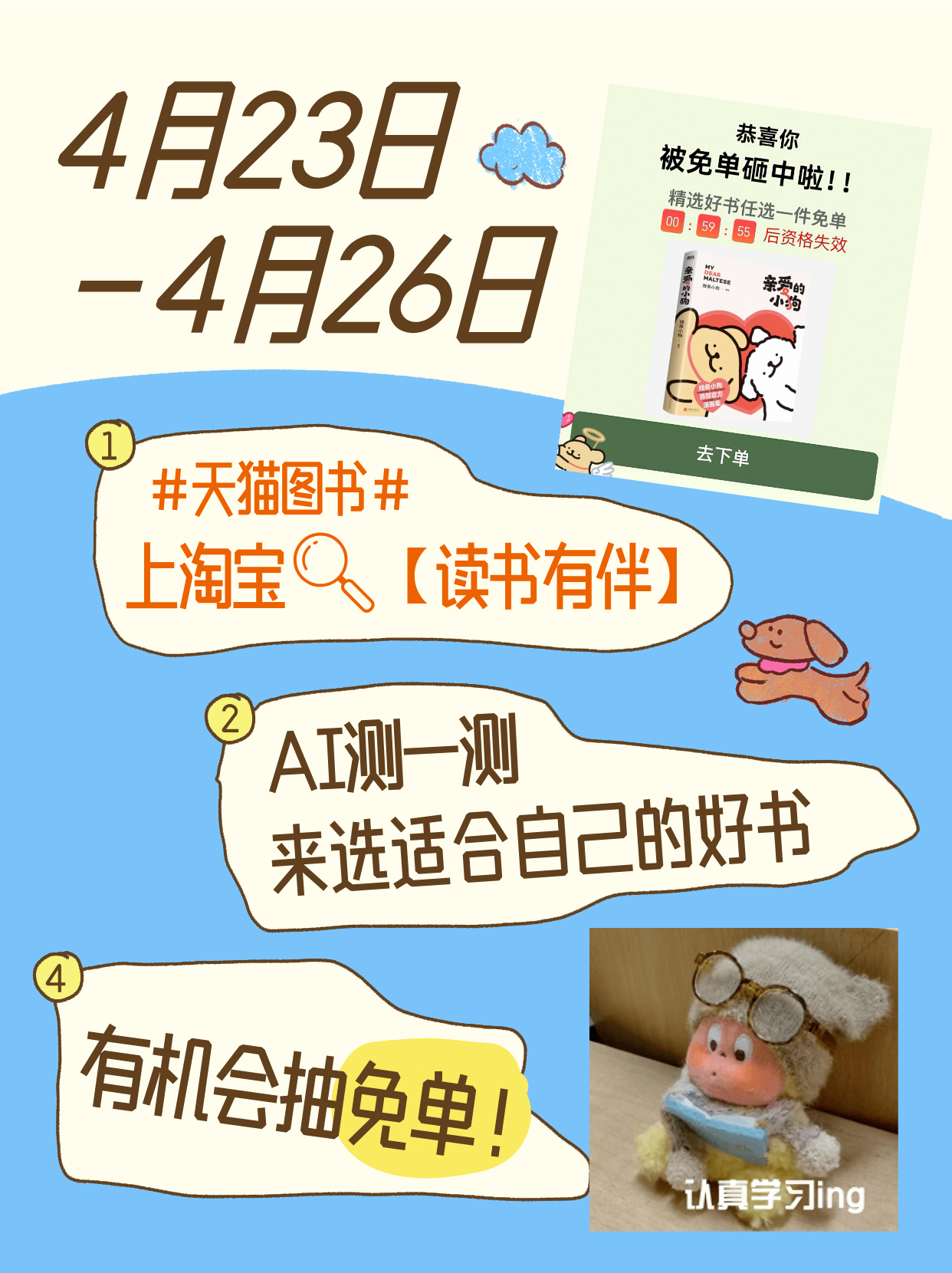 选一本合心意的书有时候比读完一本书还难,这次天猫图书帮你解决这个问题,天猫世界读书日 用AI即可匹配专属书单,还有机会抽免单。4月23日-4月26日,上淘宝搜索【读书有伴】,进入活动页后点击【AI选书 抽免单】回答问题,量身推荐适配好书,获得你的专属书单!天猫读书 读书有伴