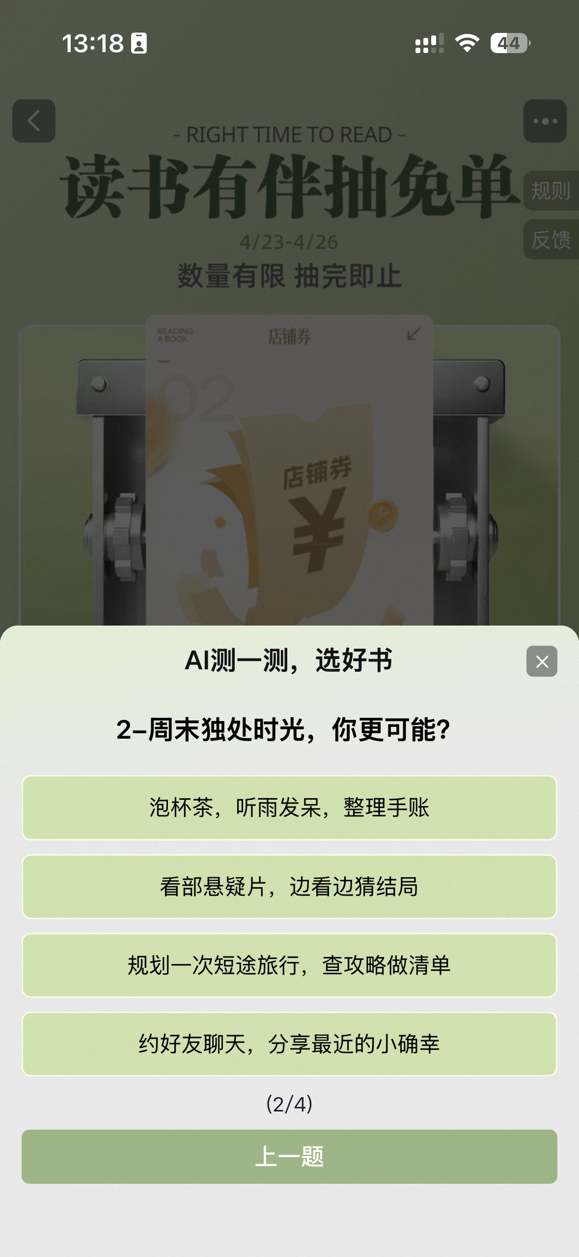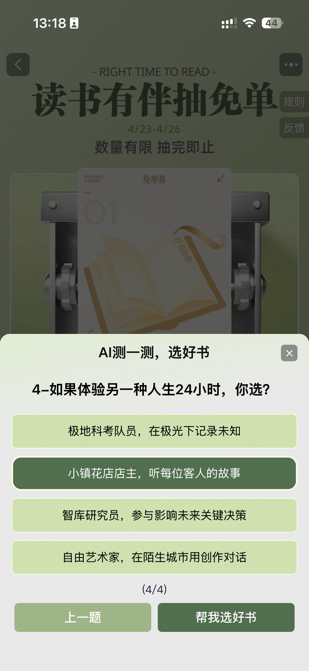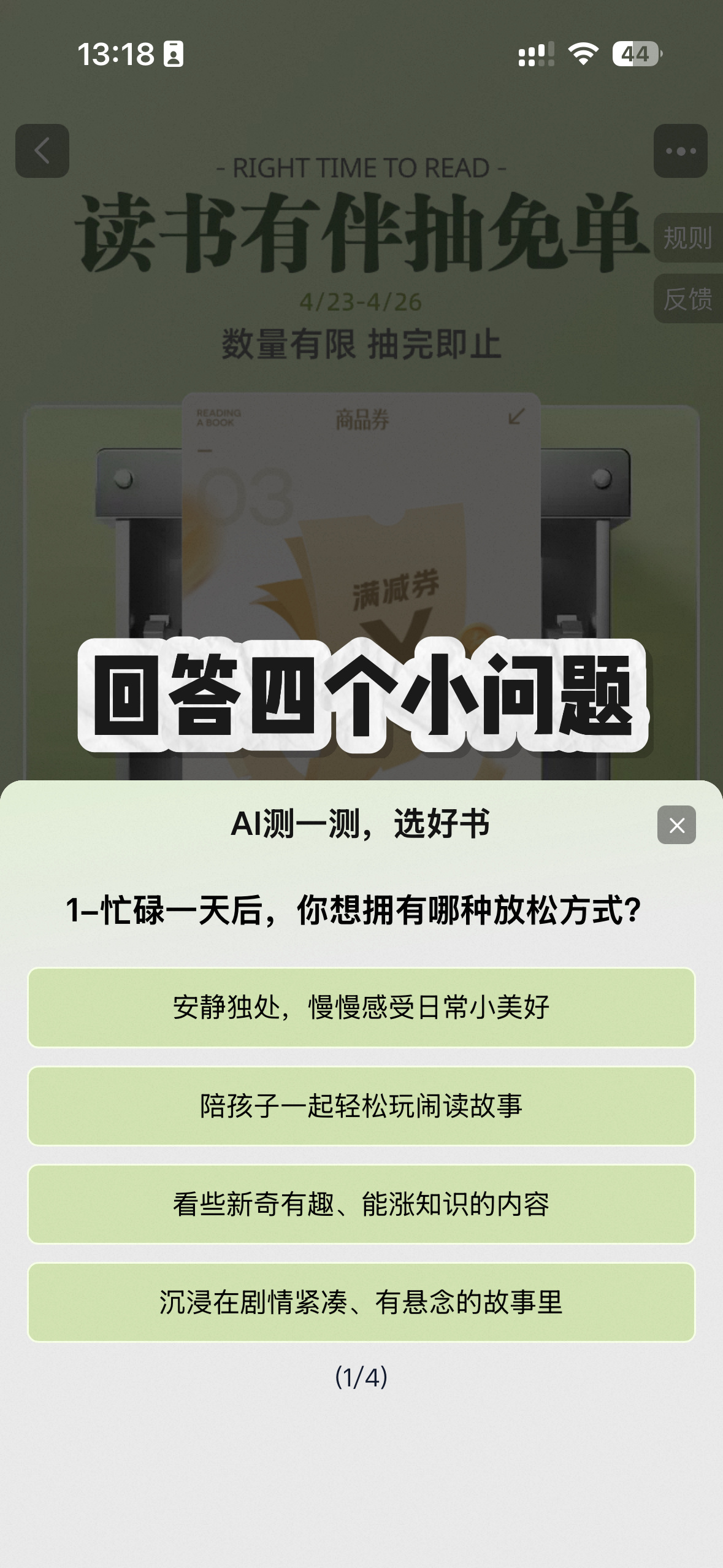 选一本合心意的书有时候比读完一本书还难,这次天猫图书帮你解决这个问题,天猫世界读书日 用AI即可匹配专属书单,还有机会抽免单。4月23日-4月26日,上淘宝搜索【读书有伴】,进入活动页后点击【AI选书 抽免单】回答问题,量身推荐适配好书,获得你的专属书单!天猫读书 读书有伴