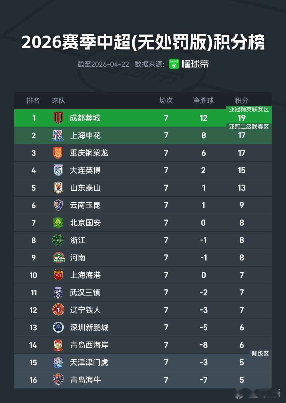 中超第7轮两榜单对比,所谓两个榜单,就是实际积分榜,和没有扣分的的积分榜,有人说没有扣分的有什么意义,其实这个榜最能反应球队的真实状态。