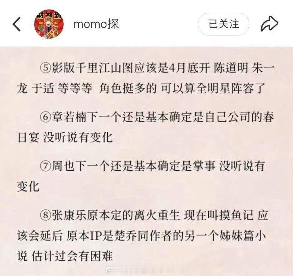 mo🍉精选👉🏻卢昱晓下一个档接触最深的是浩瀚的剧 👉🏻《恰逢雨连天》 也基本确定了男女主丁禹兮和卢昱晓 不过要到Q4👉🏻丁禹兮和孟子义合作的现代戏,有悬疑元素 👉🏻《开盘》 张小斐、蔡文静、代露娃👉🏻影版《千里江山图》4月底开,陈道明、 朱一龙、 于适全明星阵容👉🏻章若楠《春日宴》,自家公司的👉🏻周也《掌事》 👉🏻张康乐的 《离火重生》 (《摸鱼记》)应该会延后,楚乔姐妹篇孟子义李昀锐三搭热度登顶丁禹兮 范思哲