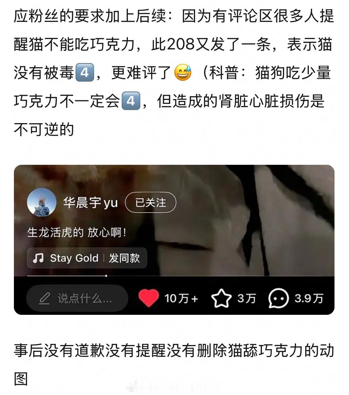 华晨宇喂猫吃巧克力蛋糕被翻出审判:起因是他之前发了自己猫咪舔巧克力蛋糕的动图,评论区粉丝提醒猫吃巧克力可能会die的,他后续只回复了猫咪没事并没有道歉。网友觉得他作为多年养猫人没有常识,被提醒后也不道歉或者删除,立爱猫人设华晨宇演唱会场地开始拆了