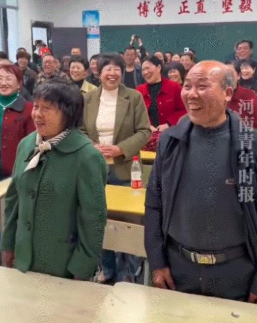 聚会当天,老同学们在教室里互相辨认彼此,昔日外号重新被喊起,有人讲起当年的糗事引发全场大笑,气氛一下子回到青春时代。