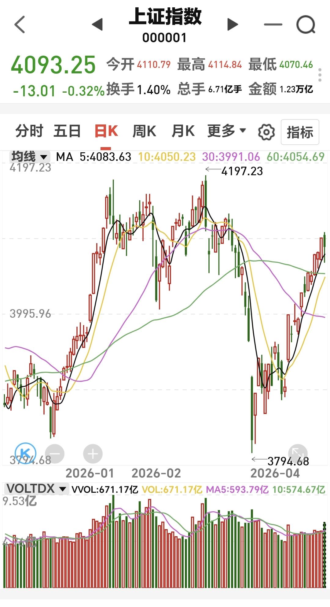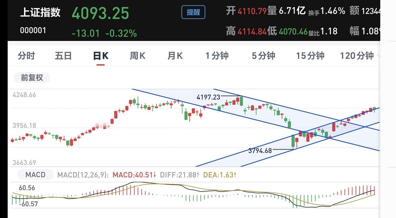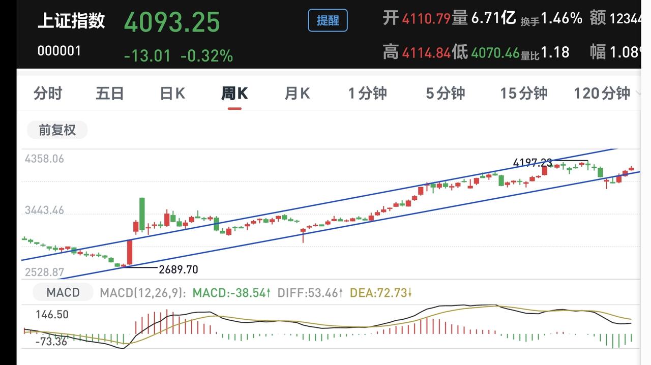 今天收盘的时候五天线位置是4083点,收盘点位,4093点,收在五天线之上,所以,到今天收盘的时候为止,还没有能够表明市场已经尽到了短期的高点。