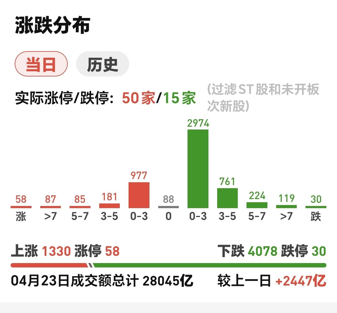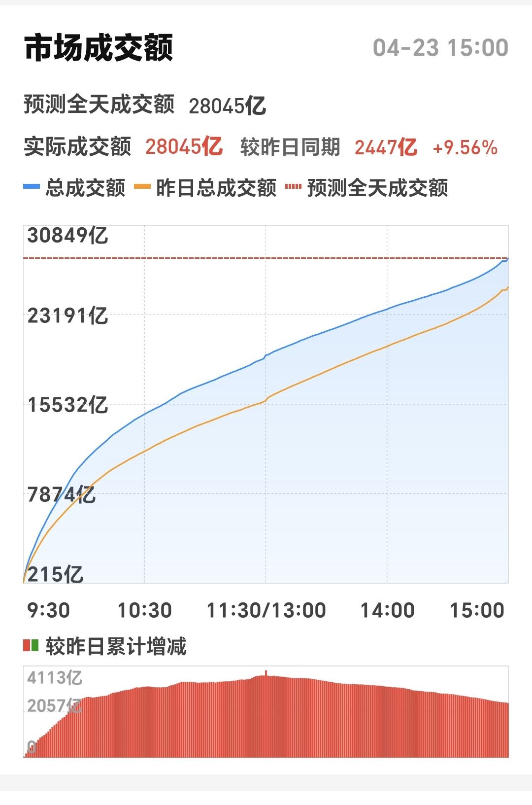 今天盘面有一个不好的现象,那就是今天的成交量是近期最大的一个交易日,今天两市累计成交28045亿,相比于昨天放量了2447亿,放量幅度为9.56%。