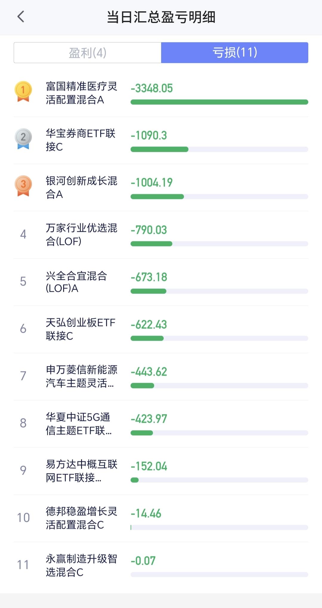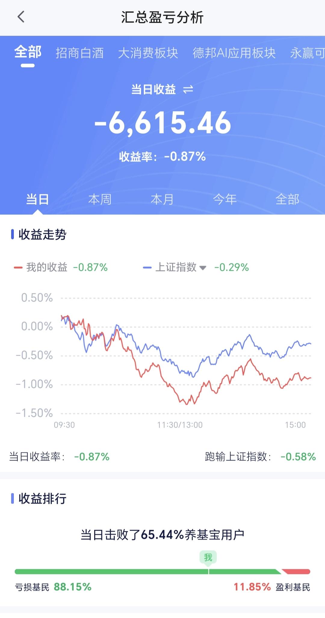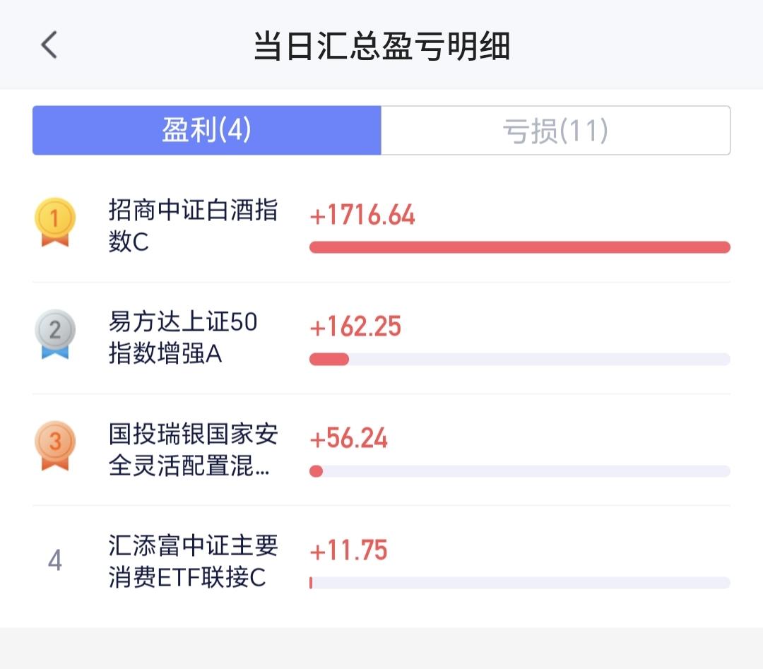 今天收盘的时候,持有基金估值盈利最多的三个板块是:白酒板块,上证50板块,军工板块,亏损金额最大的三个板块是:创新药板块,证券板块,芯片半导体板块,估值整体亏损了6615元。